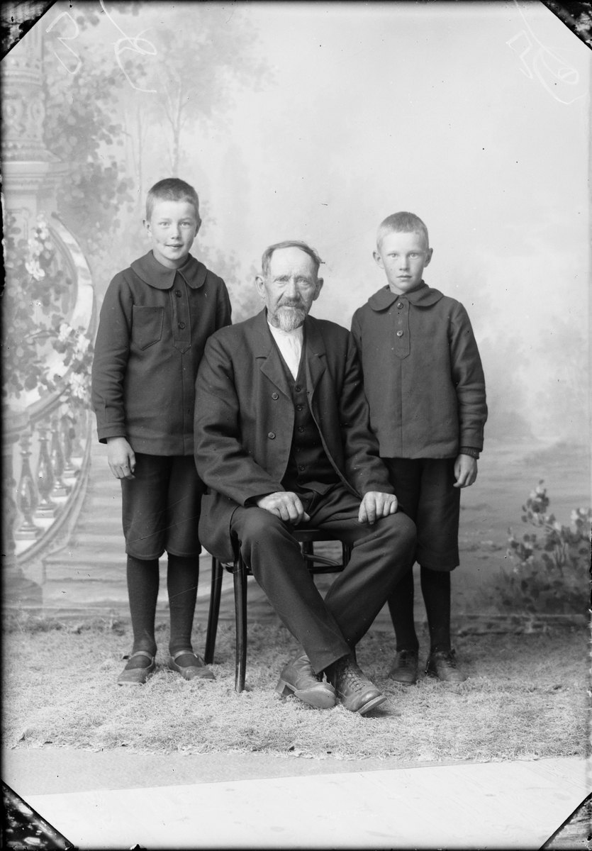 Ateljéporträtt - man och två pojkar från Singö, Uppland