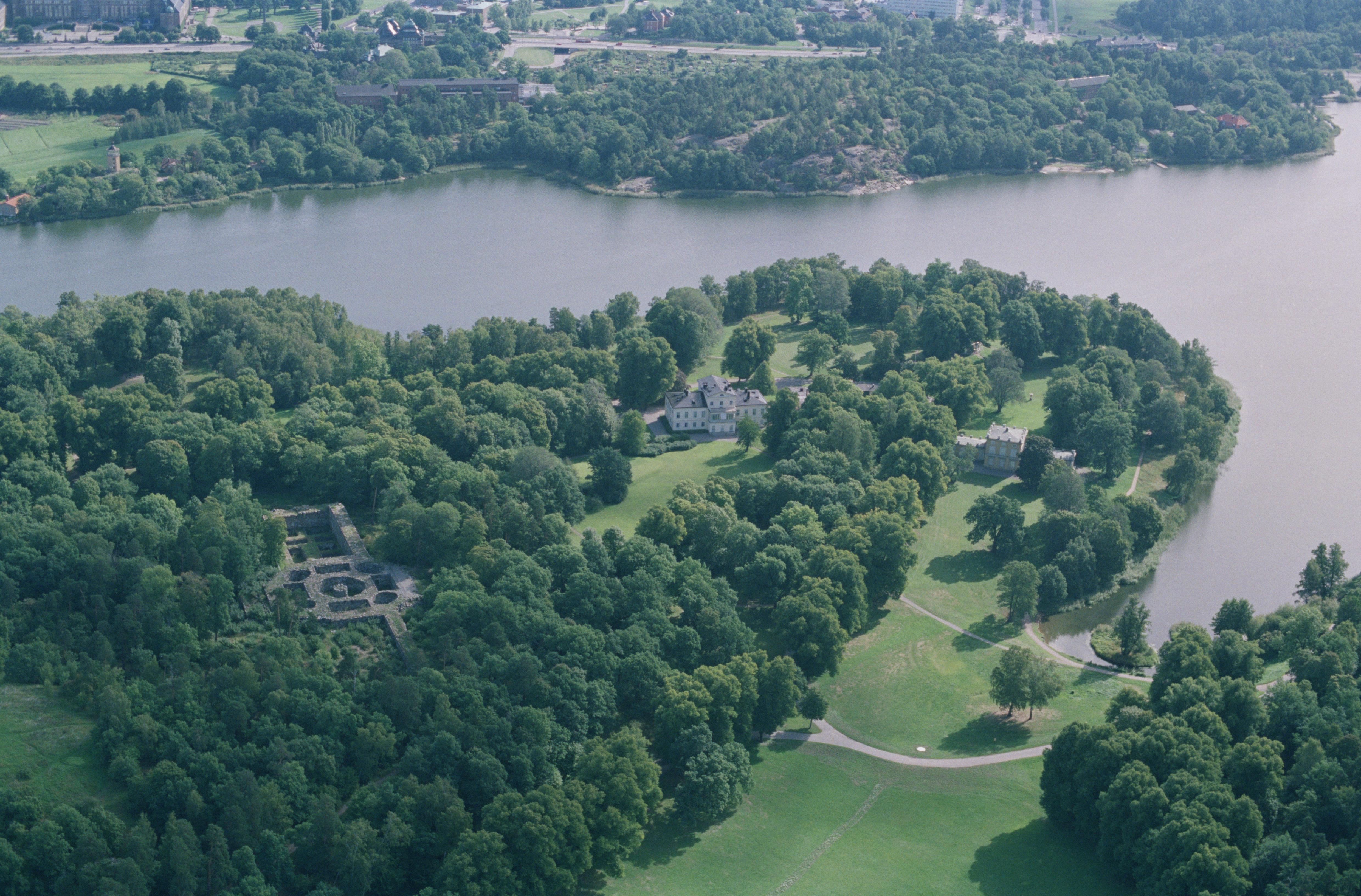 Hagaparken vid Brunnsviken. Slottsruinen, Haga slott, Gustav III:s paviljiong och Ekotemplet byggnadsminne RAÄnr Solna 30:1-3. Bilden är tagen mot (väderstreck): Ö