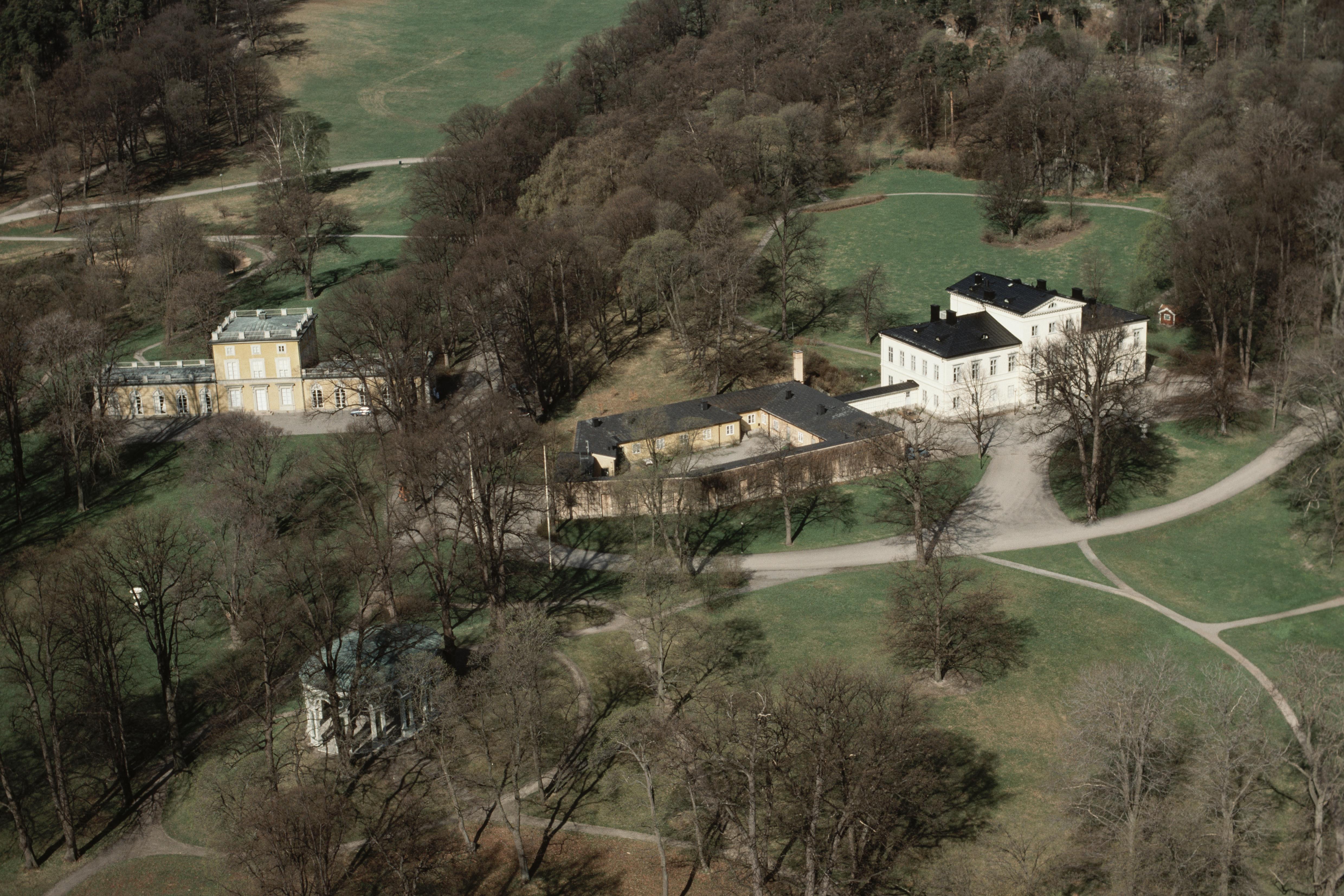 Hagaparken vid Brunnsviken. Gustav III:s paviljiong, Ekotemplet och Haga slott byggnadsminne RAÄnr Solna 30:1-3. Bilden är tagen mot (väderstreck): V