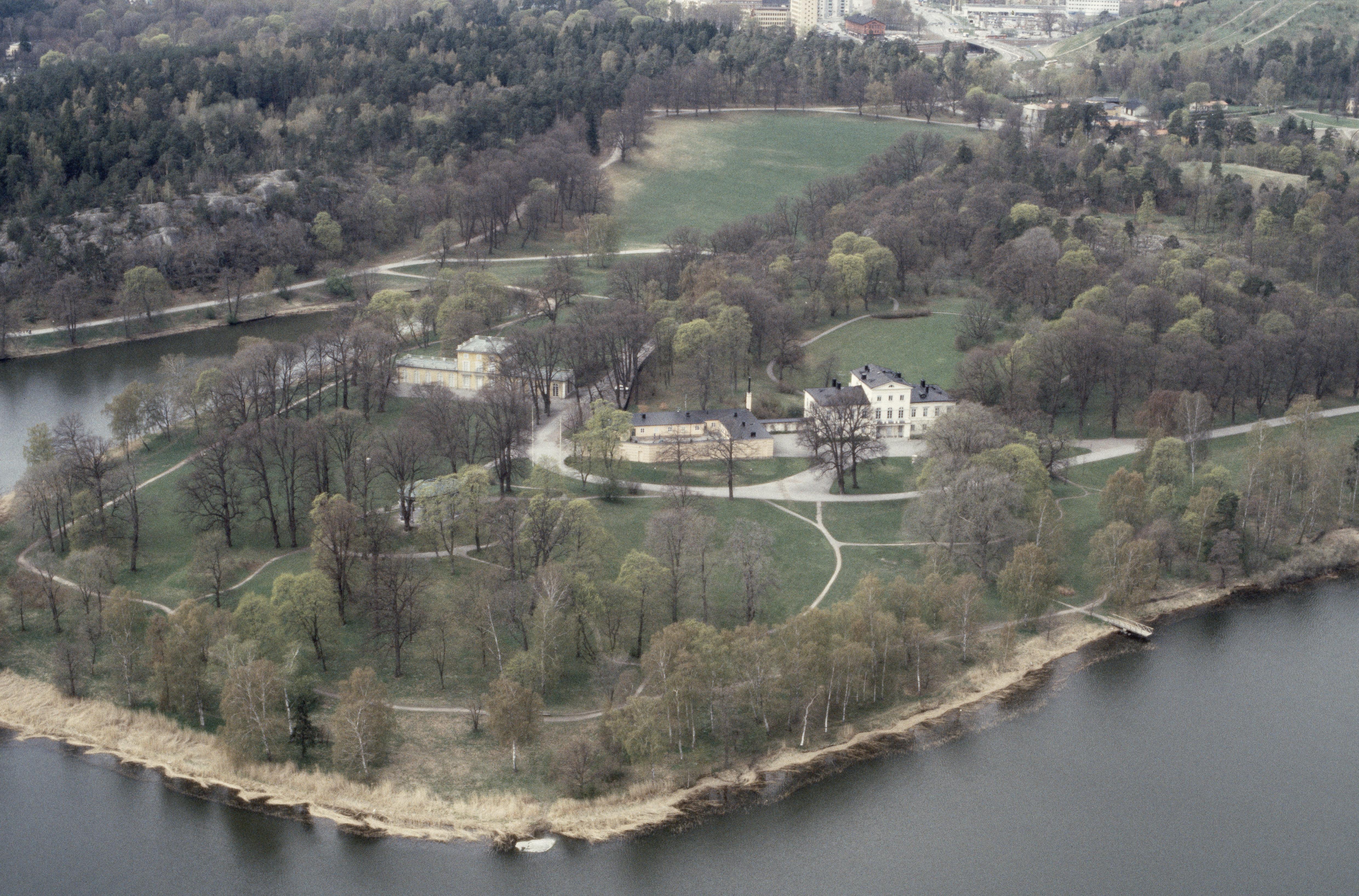 Hagaparken vid Brunnsviken. Gustav III:s paviljiong, Ekotemplet och Haga slott byggnadsminne RAÄnr Solna 30:1-3. Bilden är tagen mot (väderstreck): V