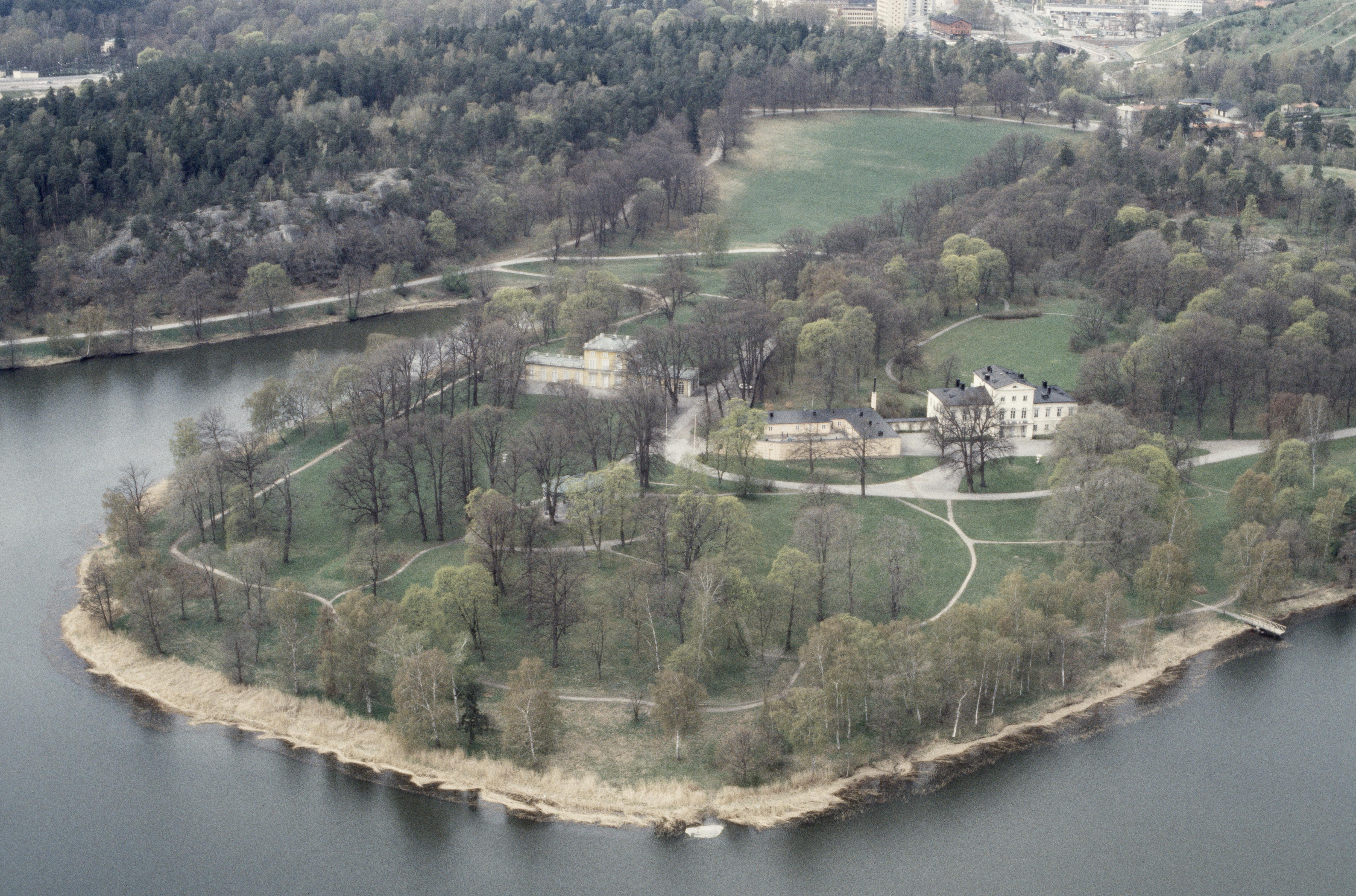 Hagaparken vid Brunnsviken. Gustav III:s paviljiong, Ekotemplet och Haga slott byggnadsminne RAÄnr Solna 30:1-3. Bilden är tagen mot (väderstreck): V
