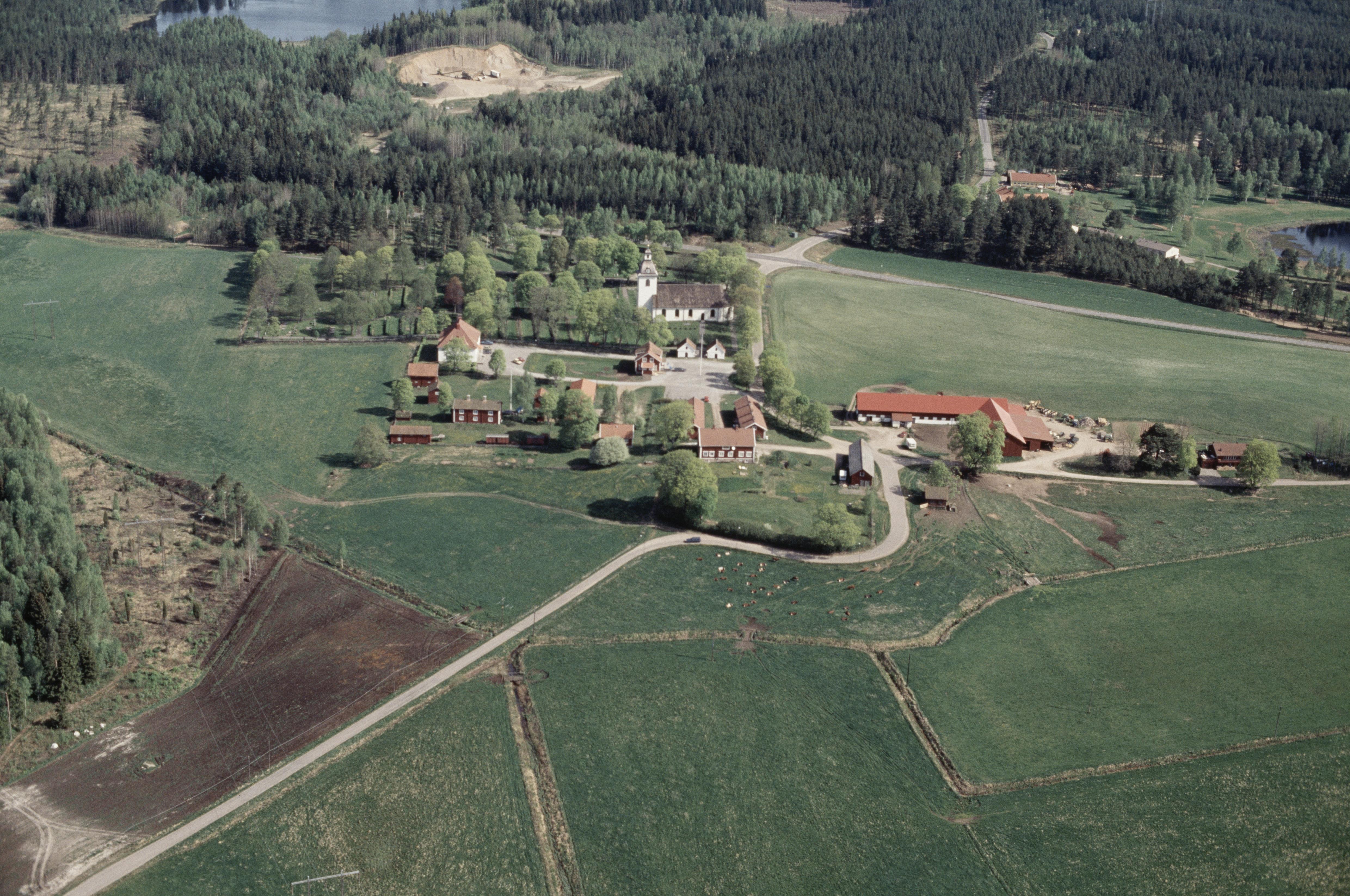 Lerbäcks kyrka, Lerbäcks hembygdsgård RAÄnr Lerbäck 130:1 och Gamla gästgivaregård Lerbäck 148:1. I bildens övre del Klockarhyttesjön. Bilden är tagen mot (väderstreck): NNO