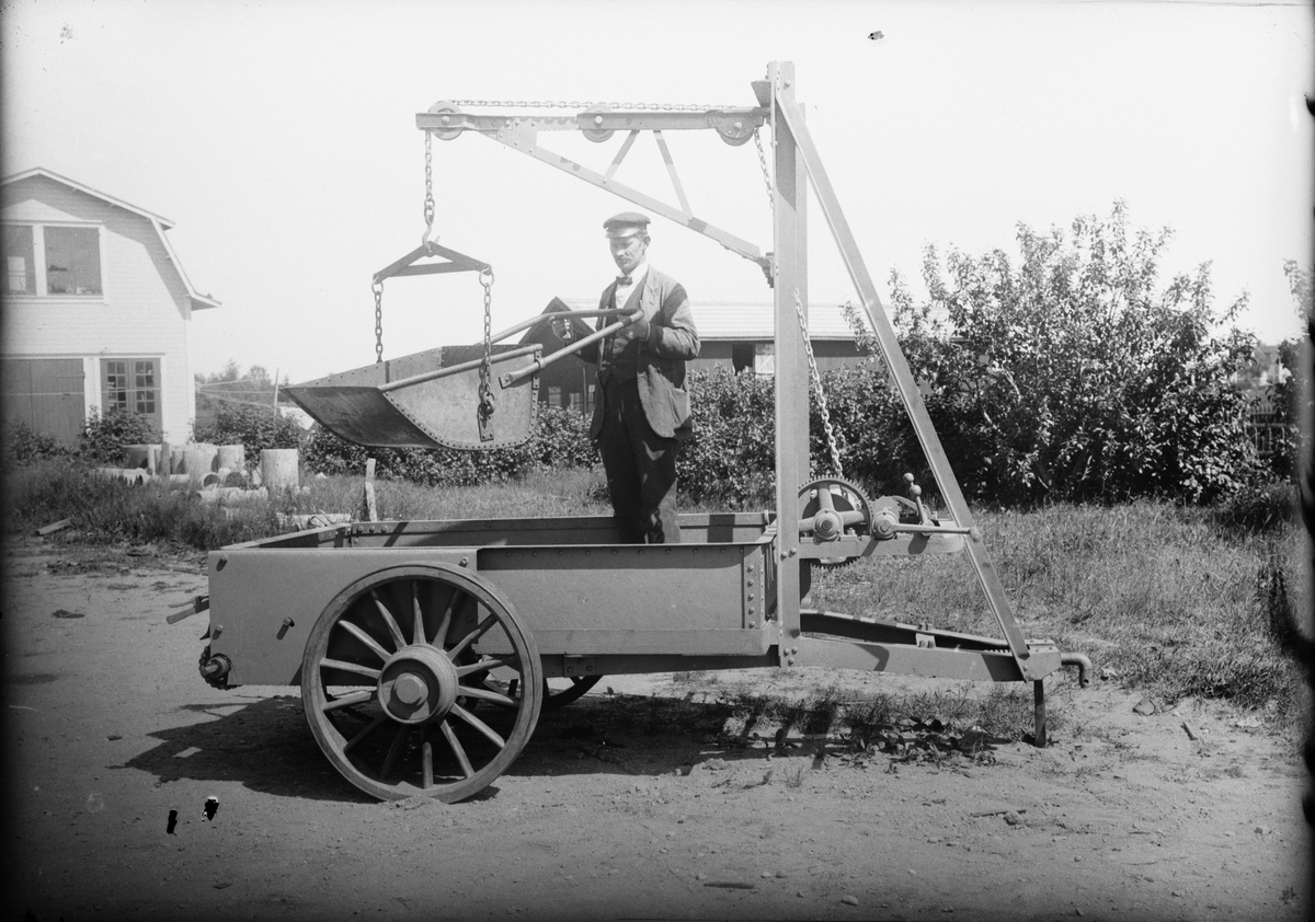 Östhammars bilcentral - "Jansson visar grävskopa på flakvagn", Östhammar, Uppland