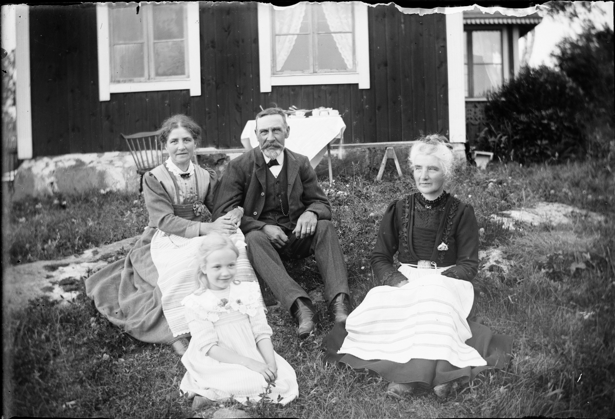 En man, två kvinnor och en flicka sitter i gräset vid sitt hus, Östhammar, Uppland