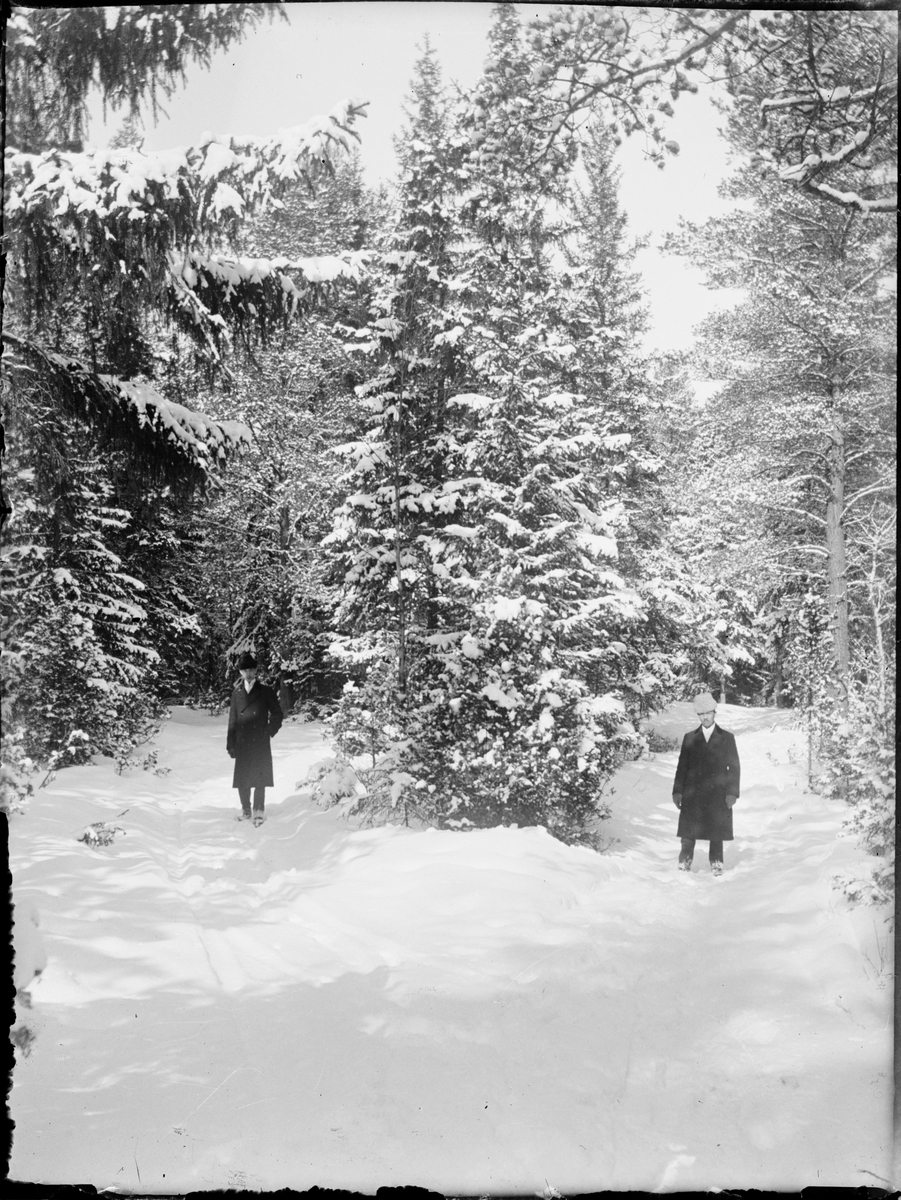 Två män står i snön vid en stor gran, Östhammar, Uppland