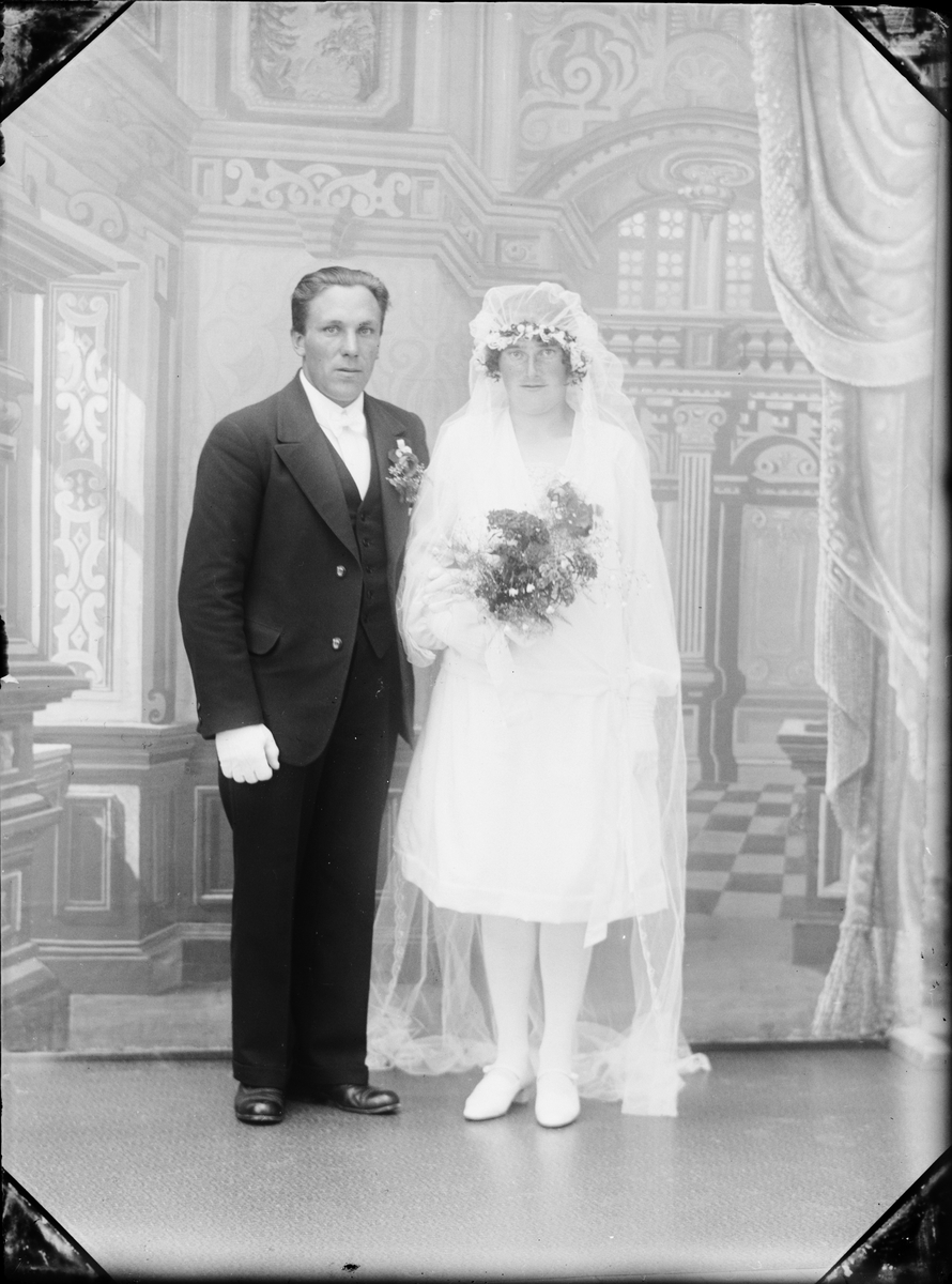Ateljéporträtt - brudparet Karlsson från Harg socken, Uppland 1929