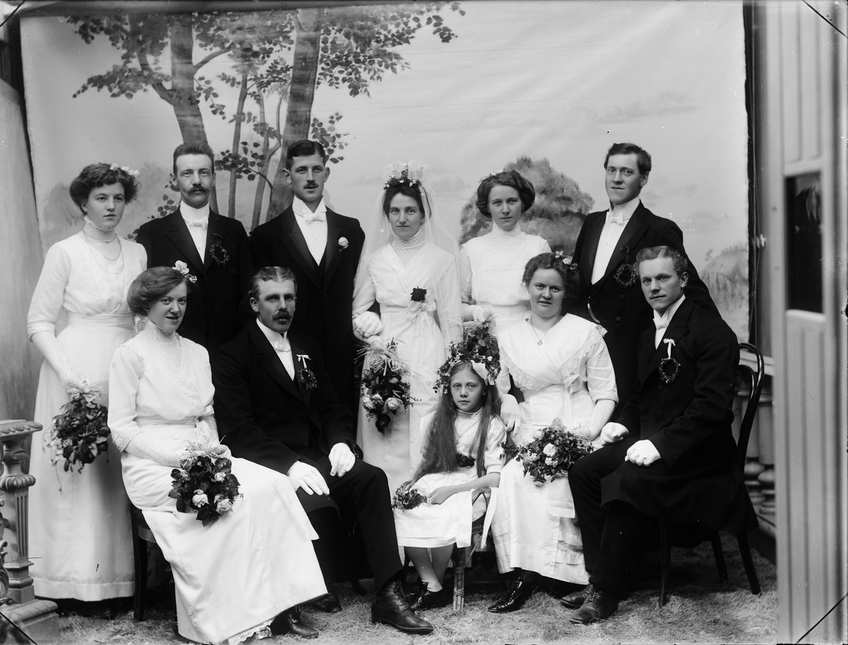 Brudpar med brudnäbb, tärnor och marskalkar, Östhammar, Uppland