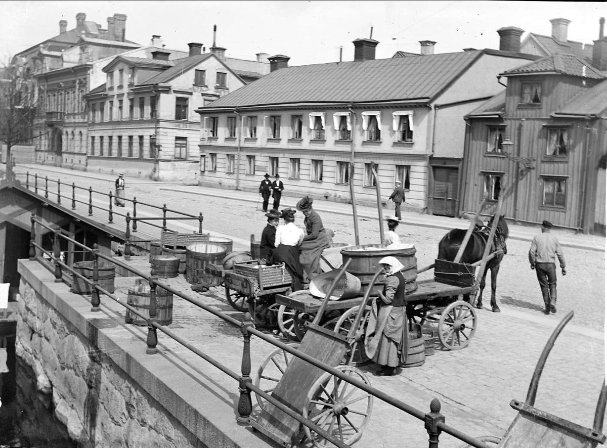 Hästekipage och kvinnor vid tvättstugan i Fyrisån, Östra Ågatan, Uppsala 1900