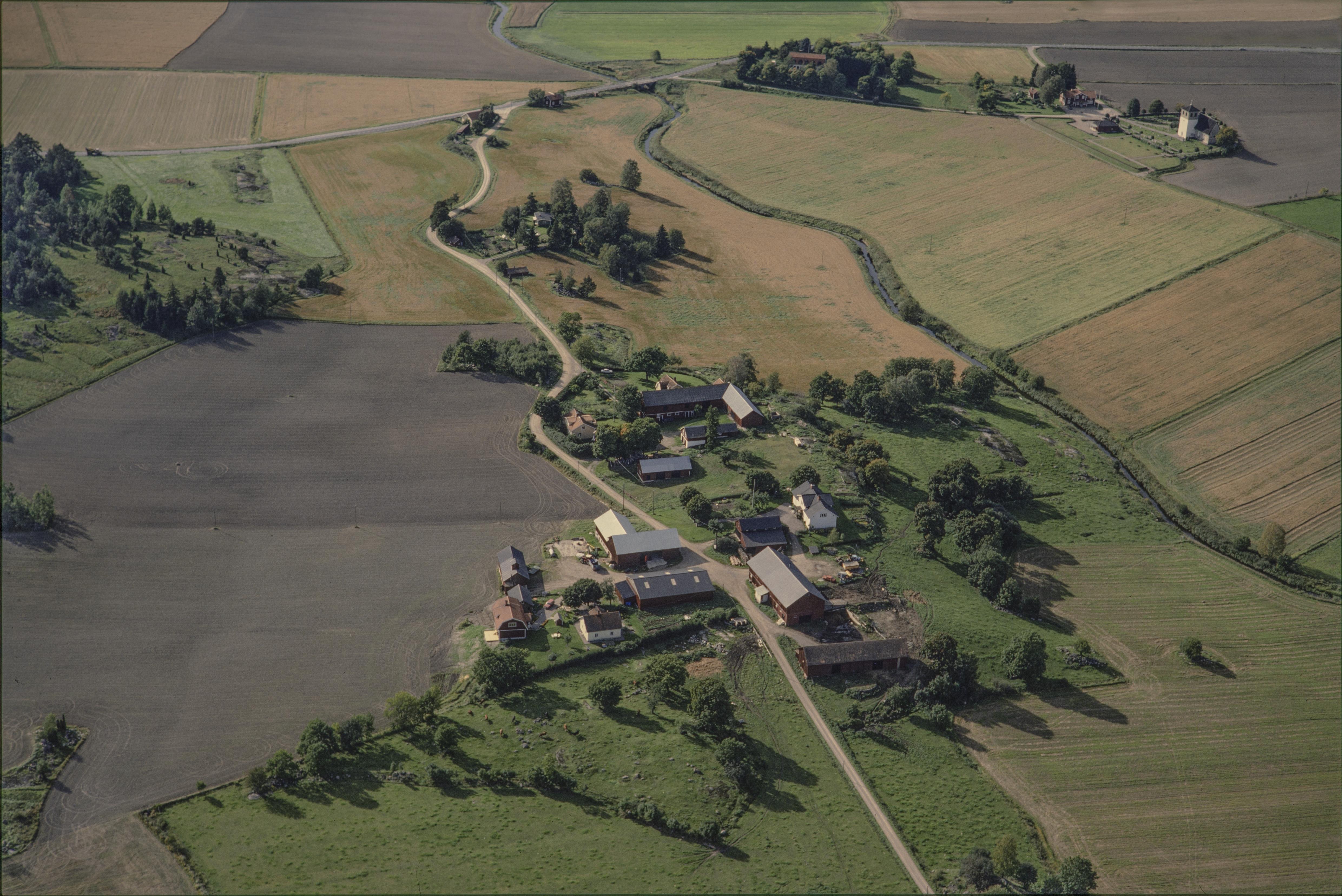 Sätuna by vid Husbyån. Vid bildens mitt bytomt RAÄnr Husby-Sjuhundra 157:1. Uppe till höger Husby-Sjuhundra kyrka. Bilden är tagen mot (väderstreck): VSV