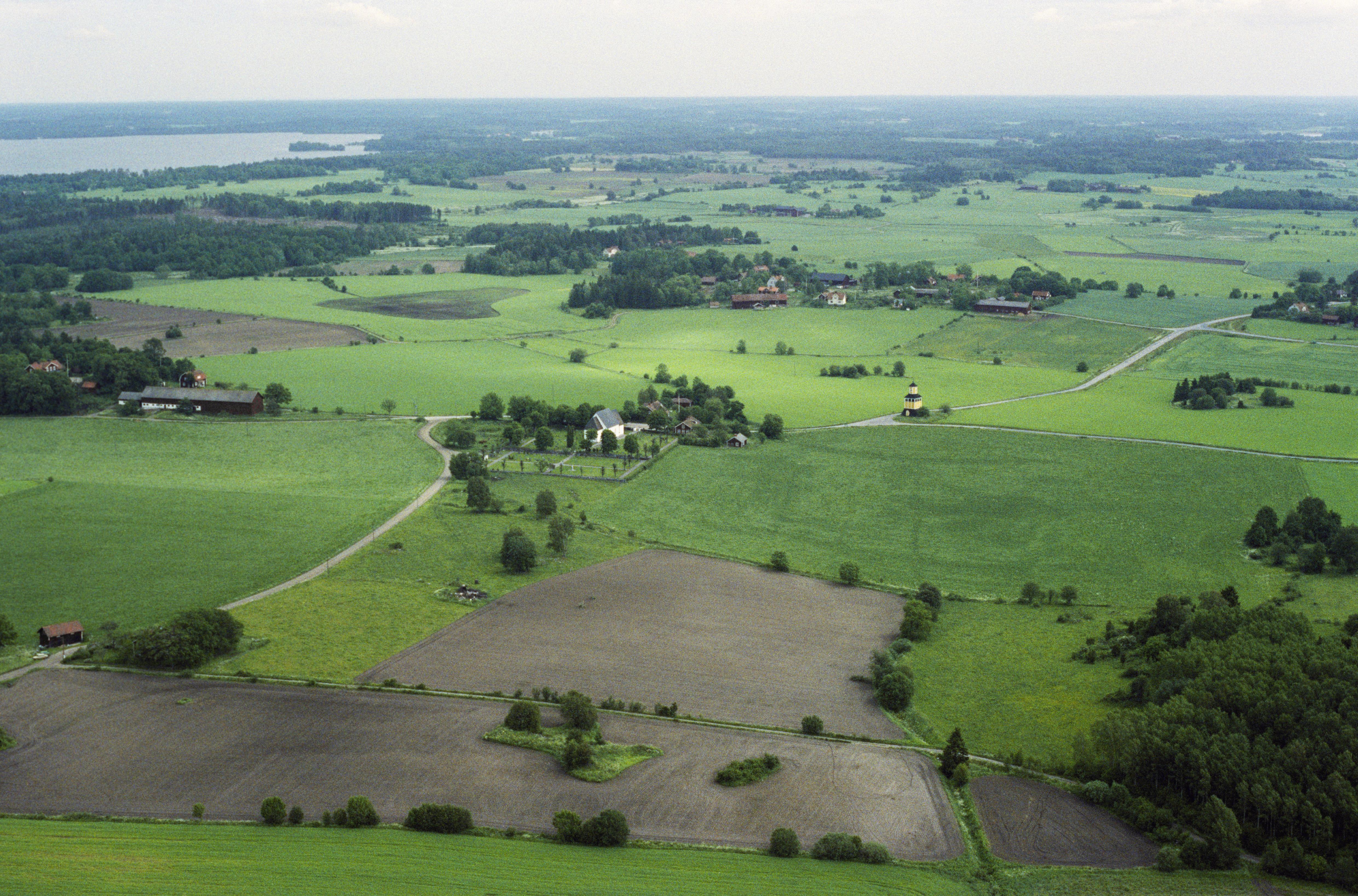 Lohärads kyrka och klockstapel i bildens mitt, från sydväst.