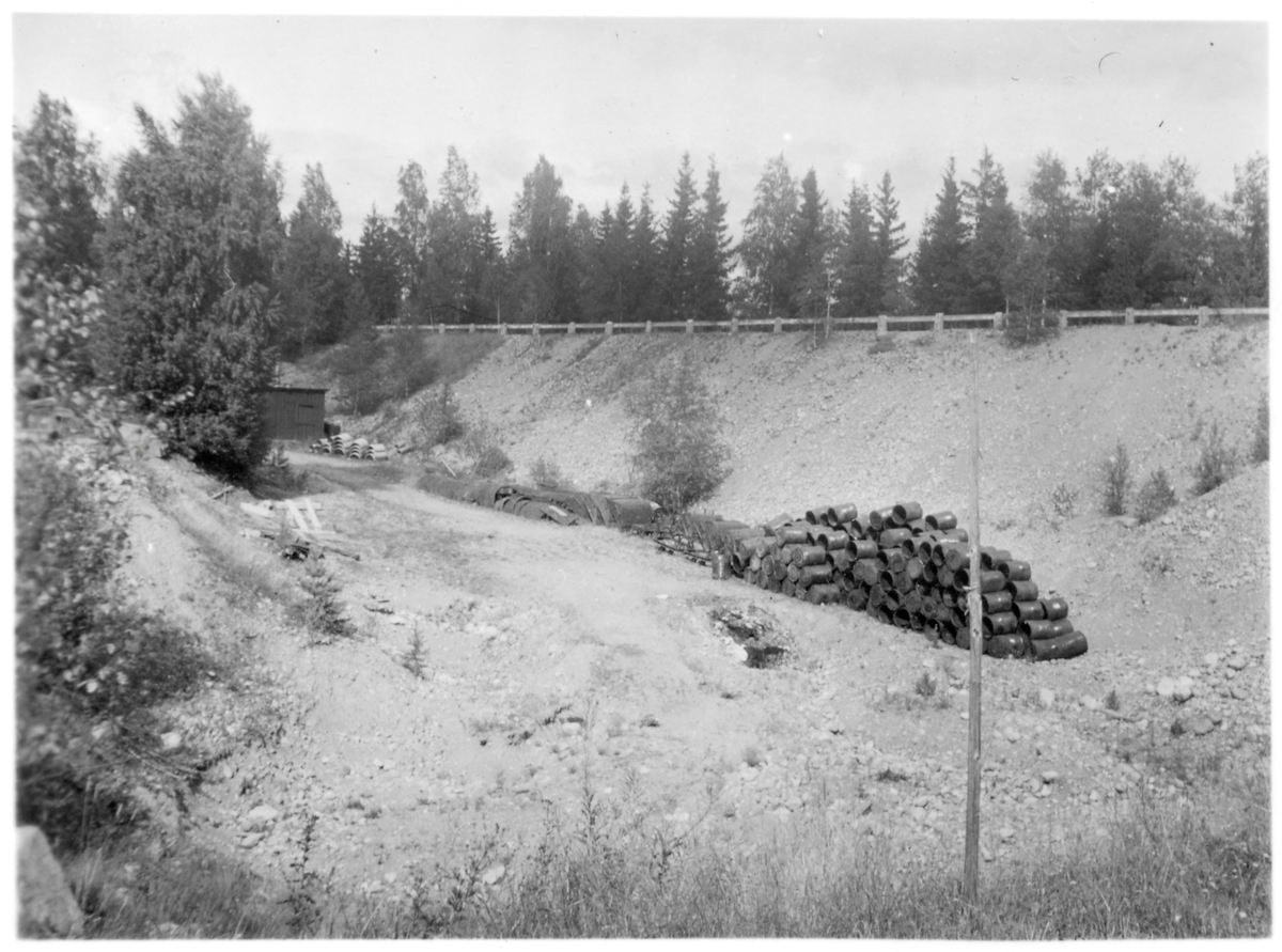 Vägstation Vmo W1, filial By. Vägmästarområdets grustag (grusgrop). Upplag av bränslefat, diverse material "skrot".
