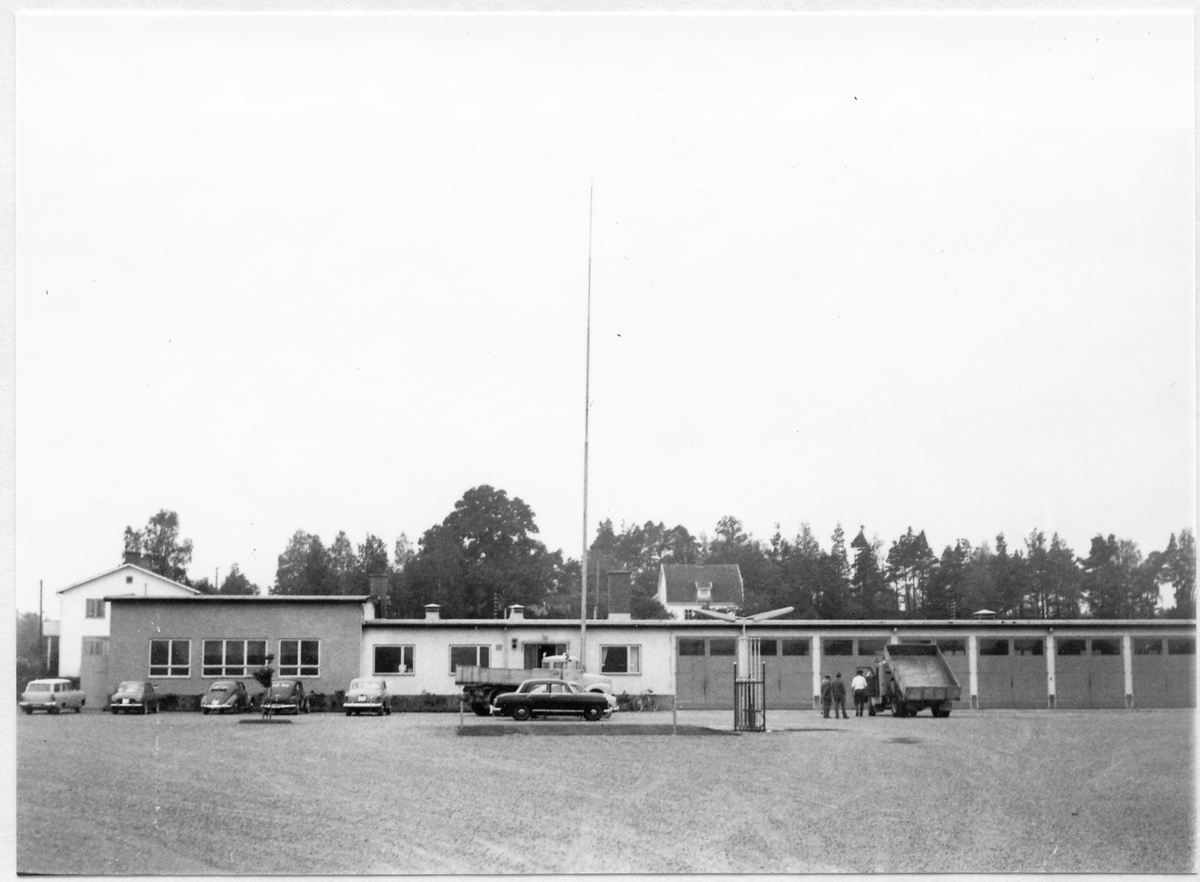 Titel: Vägstation H7, Högsby. Vägstationen huvudbyggnad med från vänster verkstadsdel, kontorsdel och garagedel. På garageplan bensinpumpar (drivmedelspumpar), lastbil med uppfällt flak. Tre manspersoner invid lastbilen. Radiomast. Personbilar.