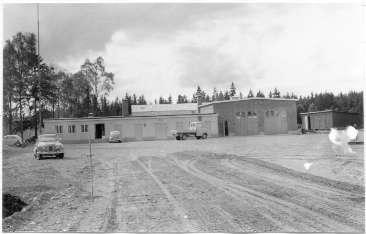 Vägstation F3, Smålandsstenar. Garageplan med kontors- förråds- och garagebyggnad i fonden. På garageplan personbilar Volvo PV, Saab, VW, liten lastbil (paketbil).