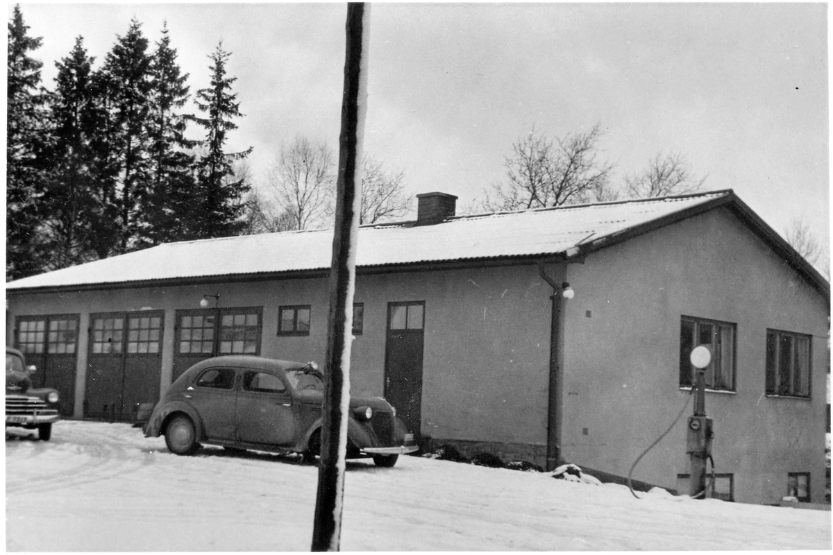 Vägstation F3, Smålandsstenar. Verkstads- och förrådsbyggnad, souterrängbyggnad. Bensinpump (drivmedelspump), personbilar.