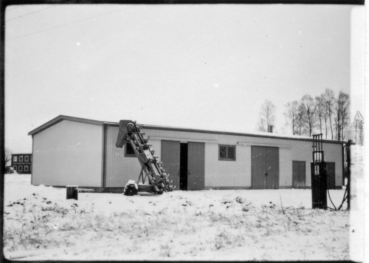 Vägstation F4, Bredaryd. Förrådsbyggnad. Lastningselevator framför byggnaden. Bensin (drivmedelspump).