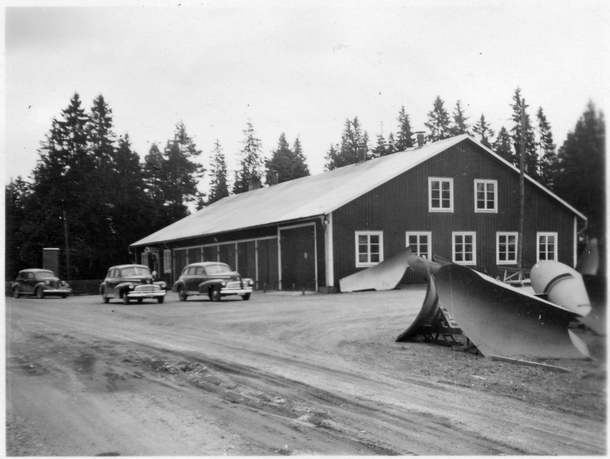 Vägstation F14, Vetlanda. Garage-, förråds- och kontorsbyggnad. Invid väg. Spetsplogar och sidoplogar. Tre personbilar framför byggnaden.