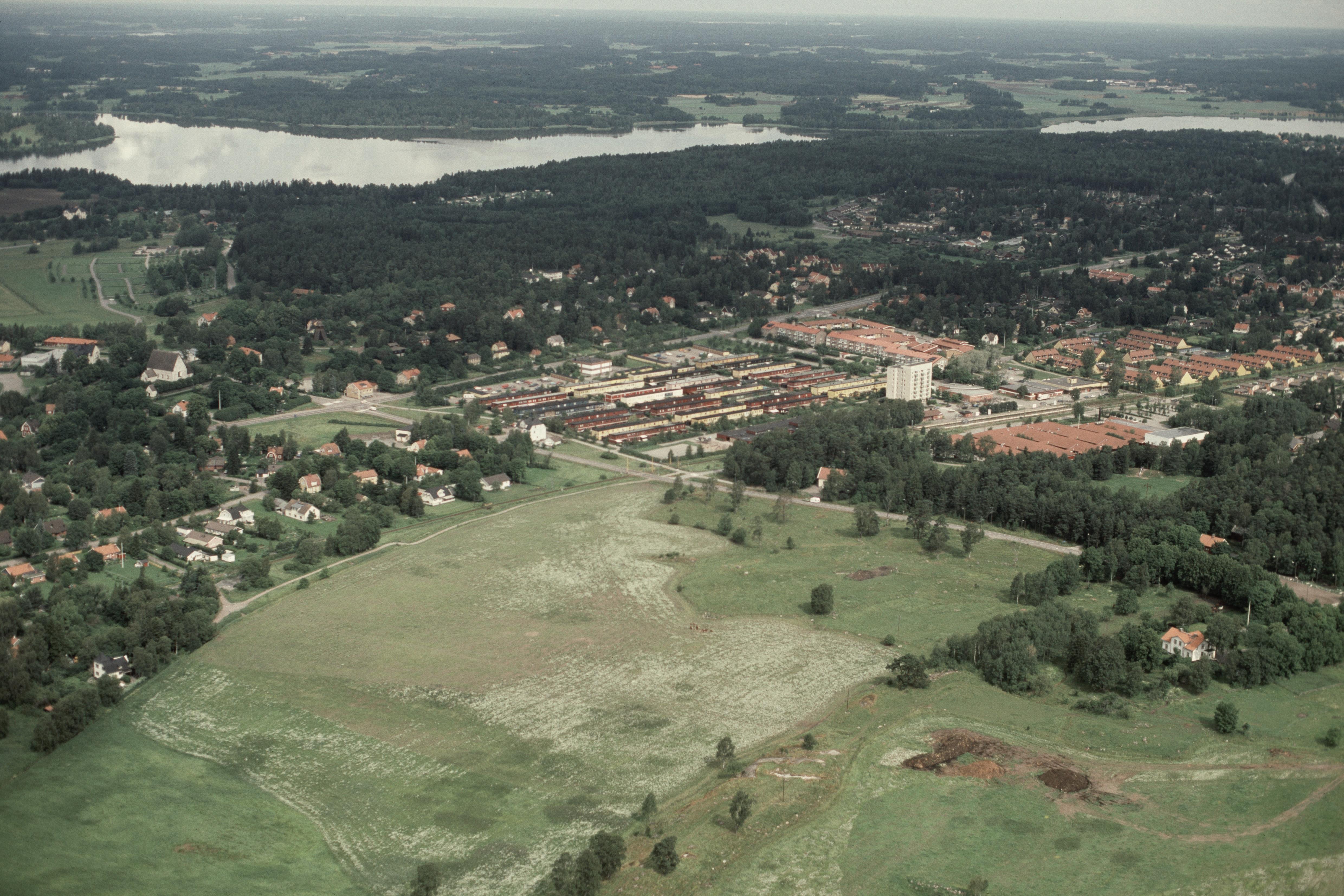 Täby kyrka RAÄnr Täby 659 och Ängby gård till vänster om bildens mitt. Täby prästgårds naturreservat och Jarlabanke golfbana i bildens nedre del. I bildens övre del Vallentunasjön. Bilden är tagen mot (väderstreck): NV