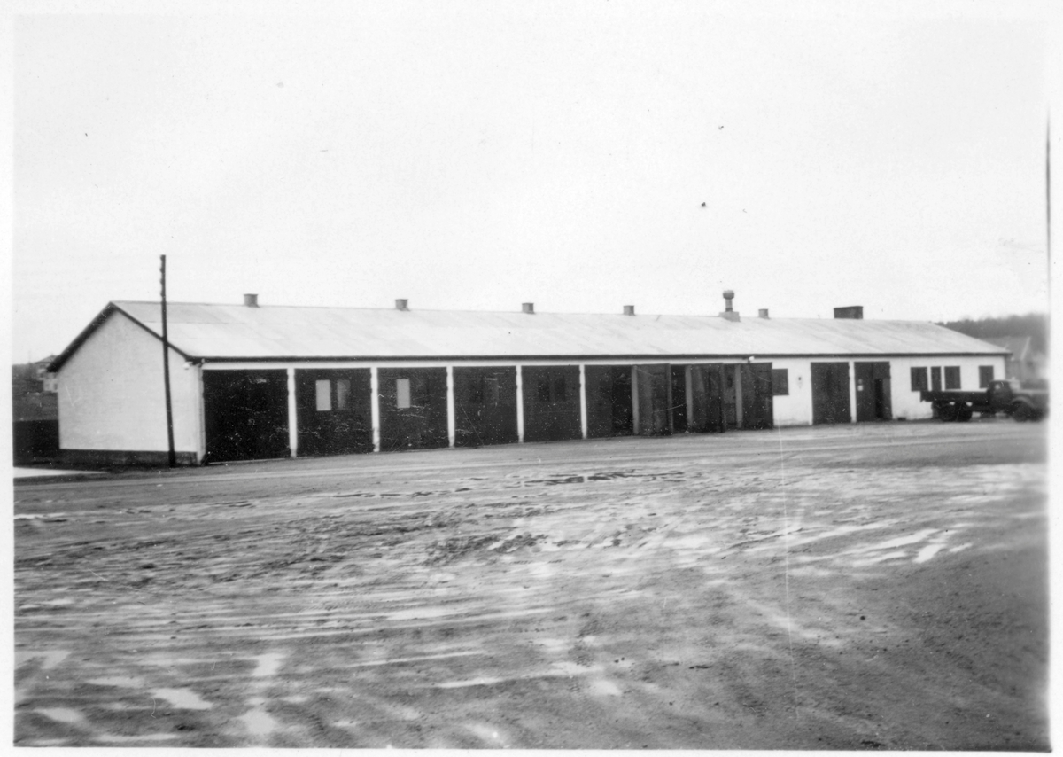 Vägstation L5, Broby. Vägstationens huvudbyggnad med från vänster garagedel, förrådsdel och kontorsdel. Lastbil framför kontoret.