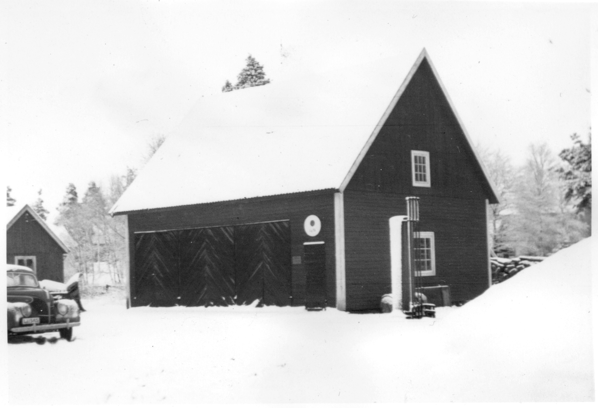 Vägstation L5, Broby, filial Osby. Garagebyggnad, bensinpump (drivmedelspump) vid gavel. Del av personbil till vänster.