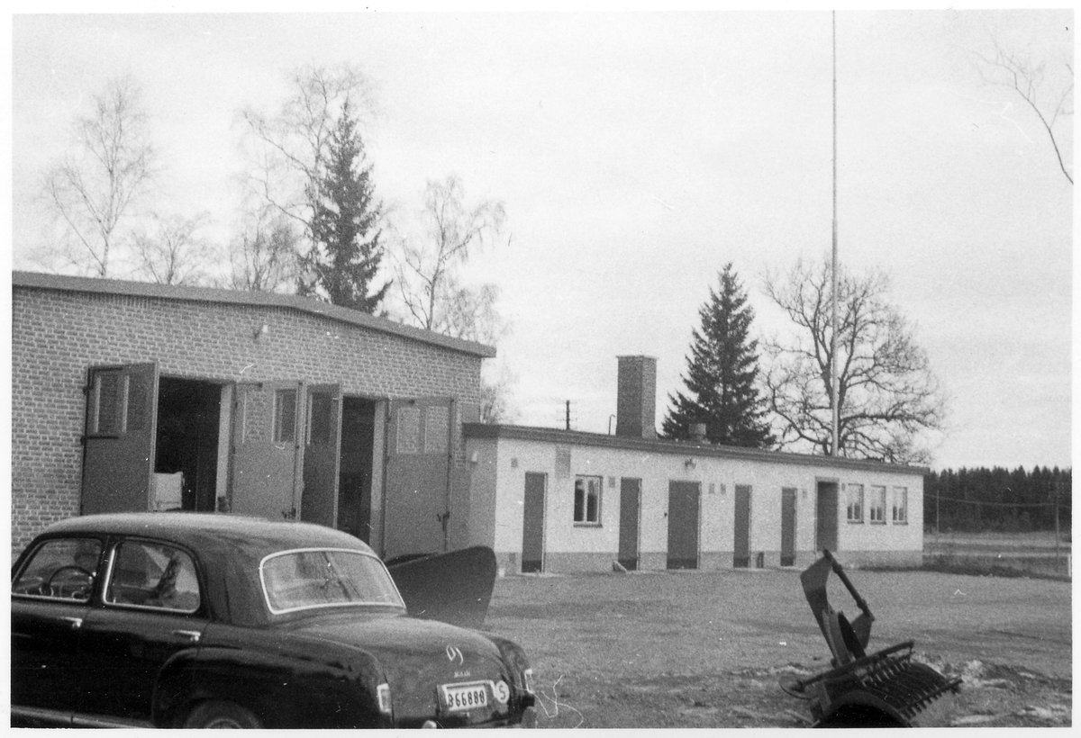 Vägstation B5 Rimbo. Vägstationens huvudbyggnad med verkstad, förrådsavdelning (varmförråd), kontorsdel. På garageplan personbil Mercedes, B66888.