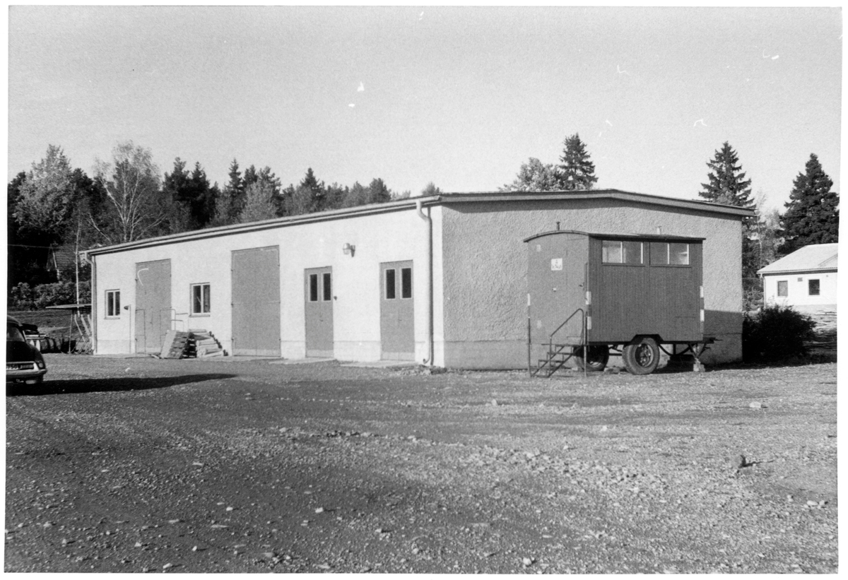 Vägstation B7, Åkersberga. Förrådsbyggnad. Manskapsvagn vid gaveln.
