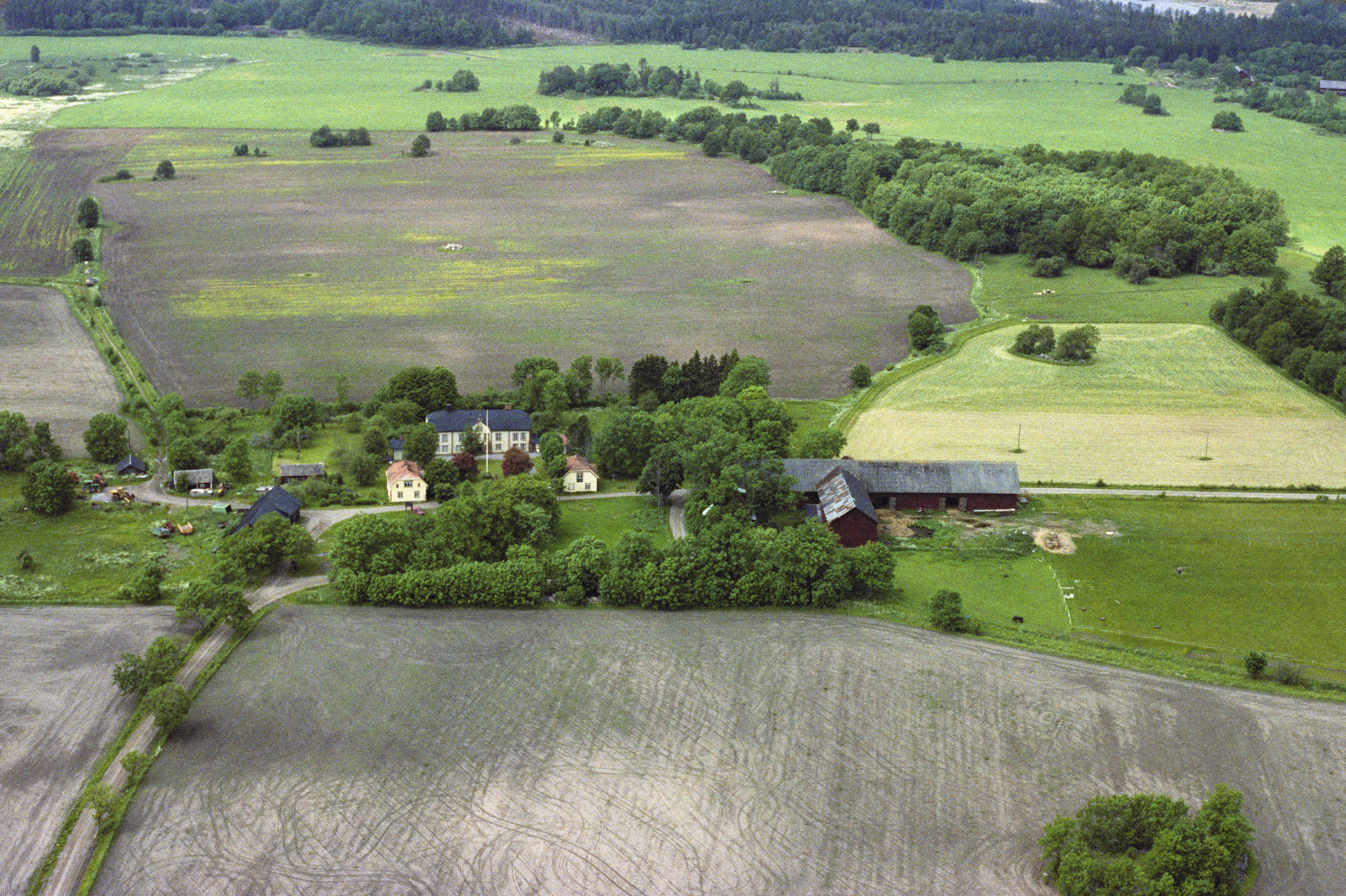 Vämlinge herrgård / Vämlinge gård. Gravfält RAÄnr Estuna 47:1 och 48:1 i bildens övre del. Bilden är tagen mot (väderstreck): V