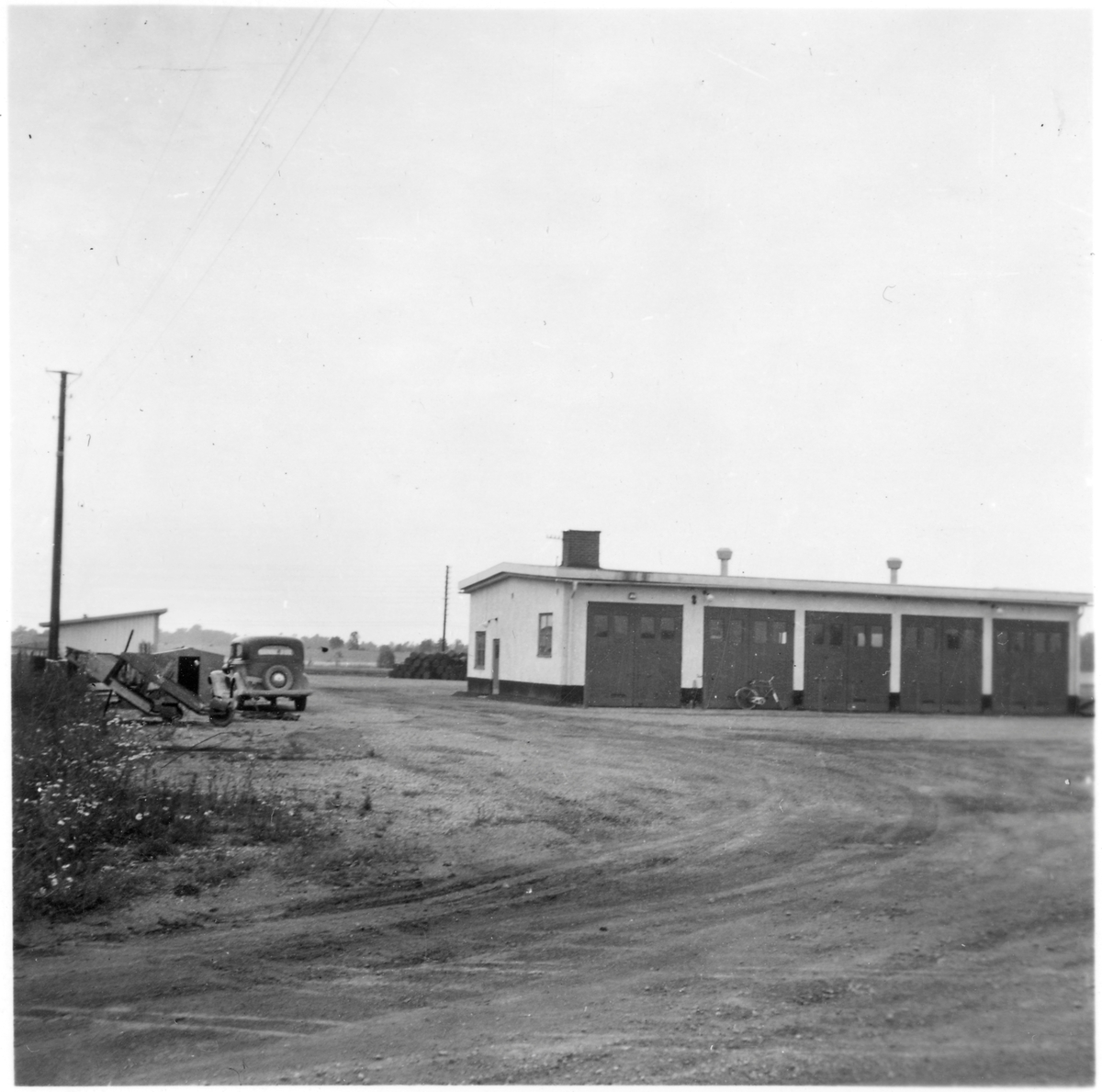 Vägstation Vmo E3, Boxholm, filial Ödeshög. Garagebyggnad. Personbil parkerad på garageplan.
