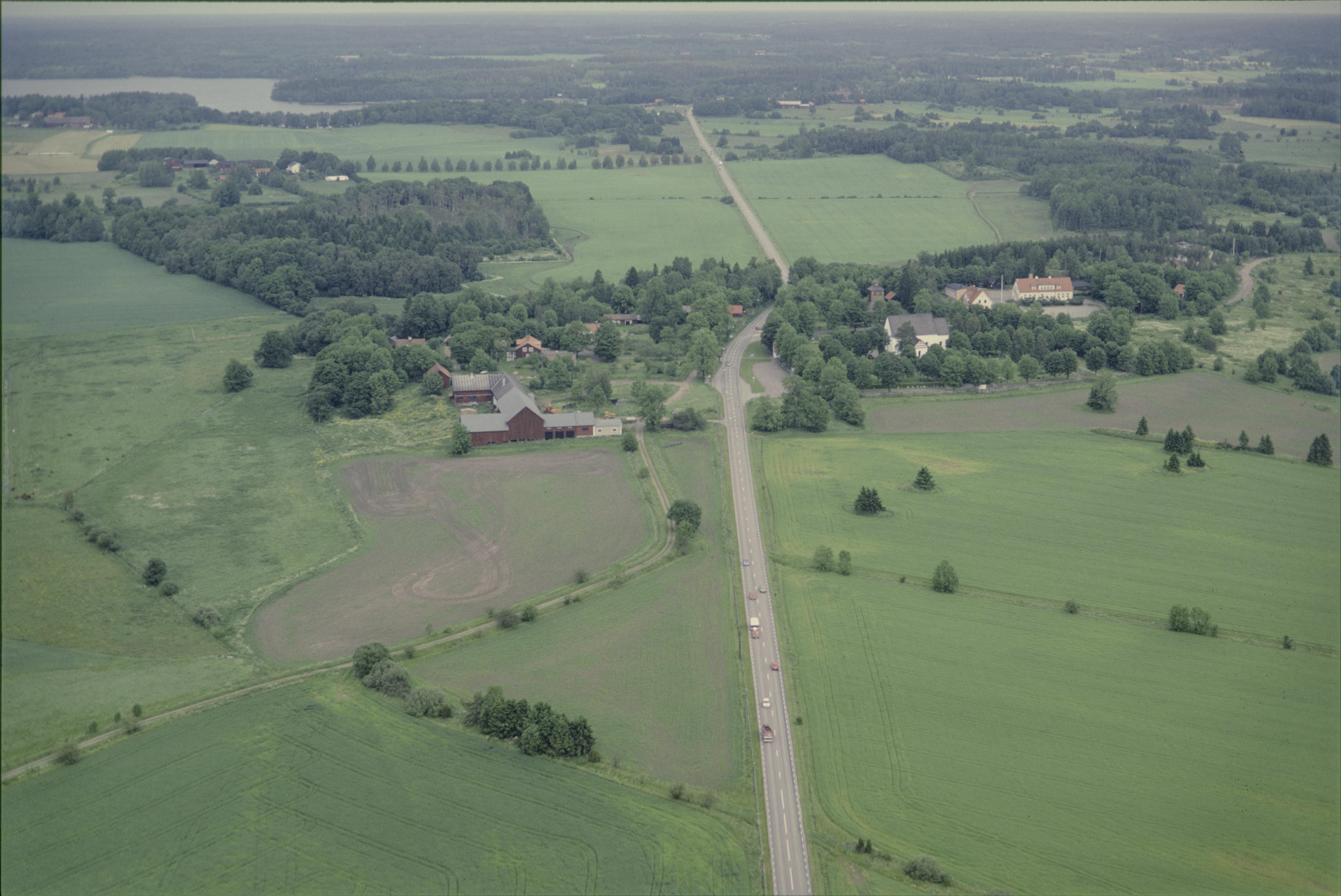 Estuna kyrka och kyrkby. I bildens övre del sjön Erken. Bilden är tagen mot (väderstreck): N