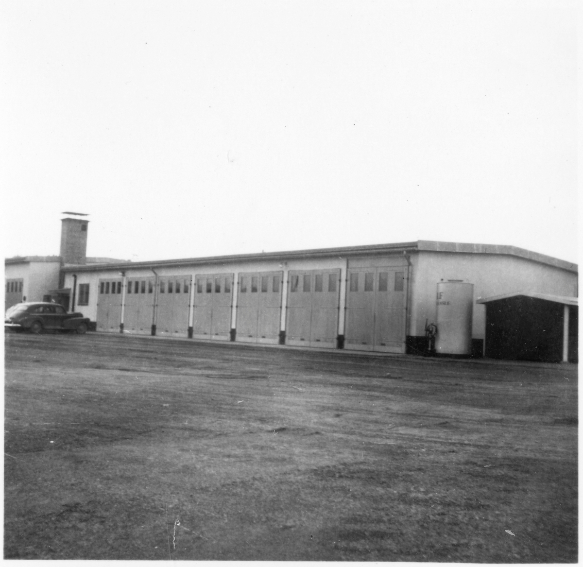 Vägstation E8, Ringarum. Byggnad med verkstadsdel, kontorsdel och garagedel. Personbilar parkerade framför garageport. Stående bränsletank vid gaveln.