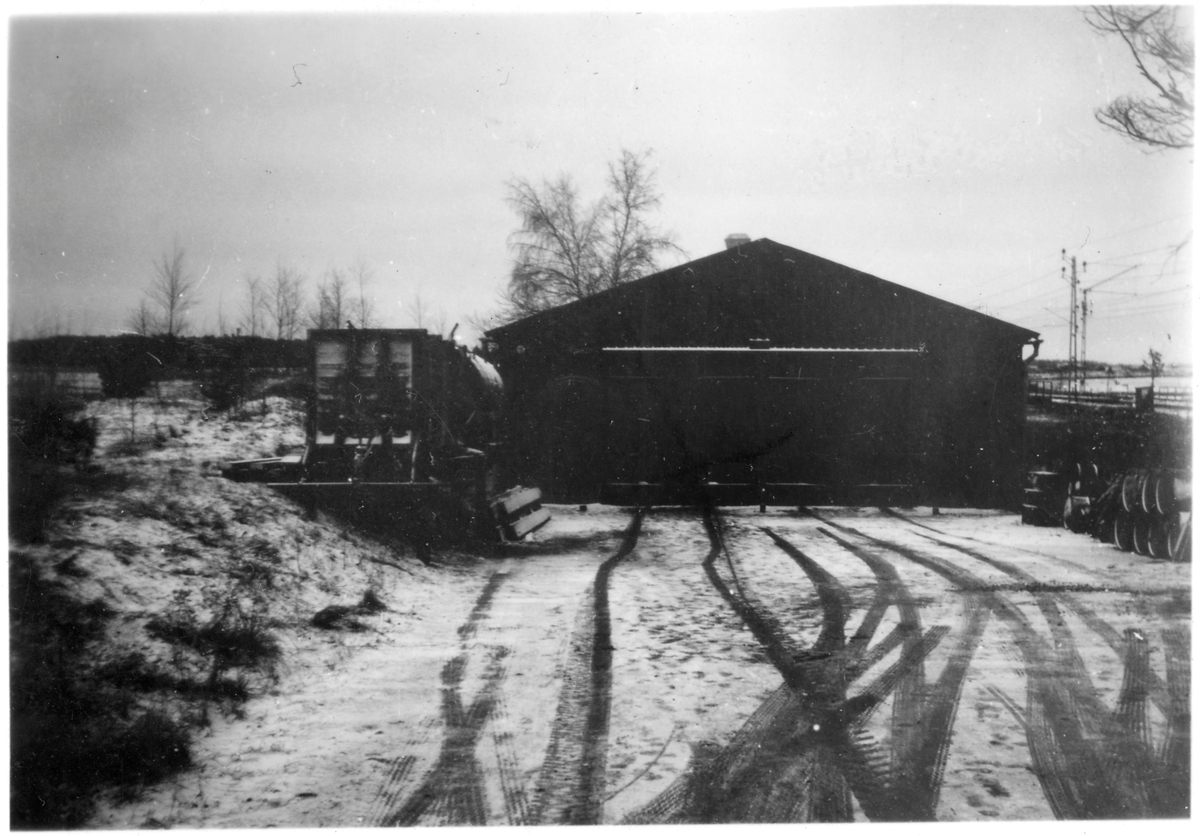 Vägstation E9, Gistad, filial Linghem. Garagebyggnad med portar på gaveln. Upplag av bränslefat. Till vänster anläggning för drivmedel. Invid järnväg.