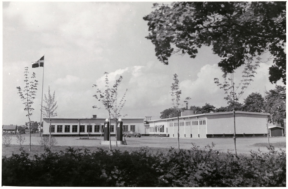Vägstation E9, Gistad. Depåverkstad. Huvudbyggnad med verkstadsanläggningen till vänster, garageanläggning till höger. Kontorsdel mellan dessa byggnader. Personbil Volvo PV på garageplan, bensinpumpar (drivmedelspumpar). Flaggstång med svenska flaggan.
