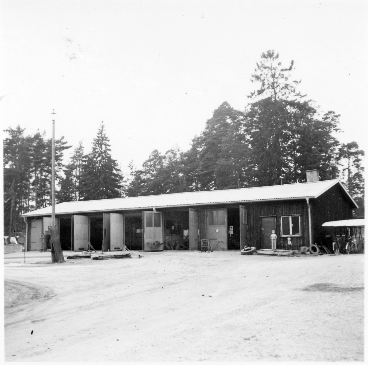 Vägstation E10, Östra Husby. Garage- och förrådsbyggnad. Två barn utanför förrådsdelen. Cykelställ med cyklar vid gaveln.