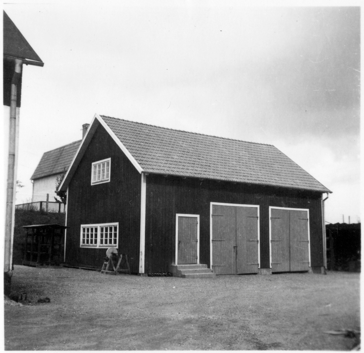 Vägstation E11, Motala. Förrådsbyggnad, vid gaveln slipstenbock med slipsten. I bakgrunden bostadshus.