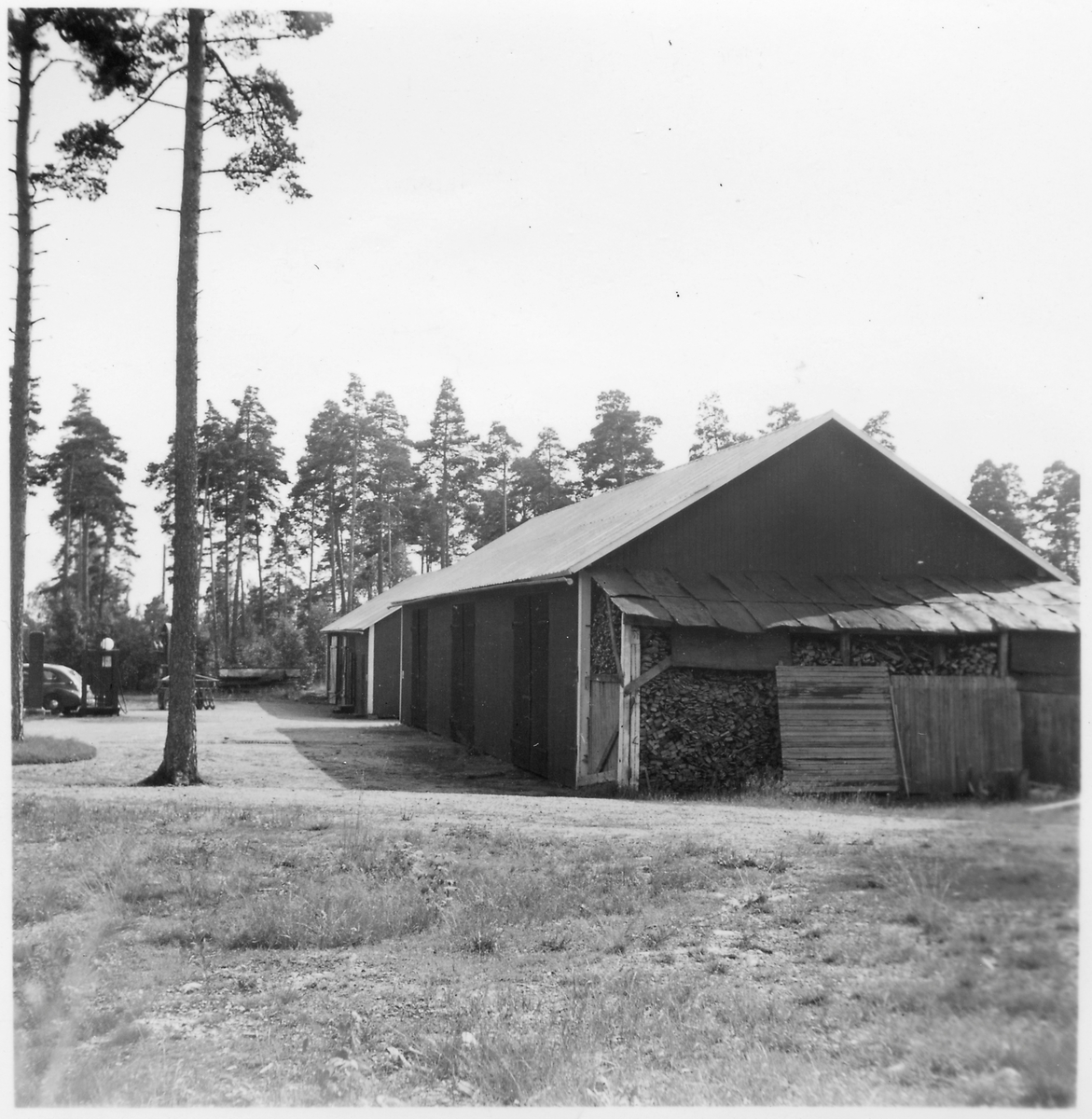 Vägstation C4, Björklinge. Förrådsbyggnader. Vedupplag vid gaveln. Bensinpump (drivmedelspump) och personbil i bakgrunden.