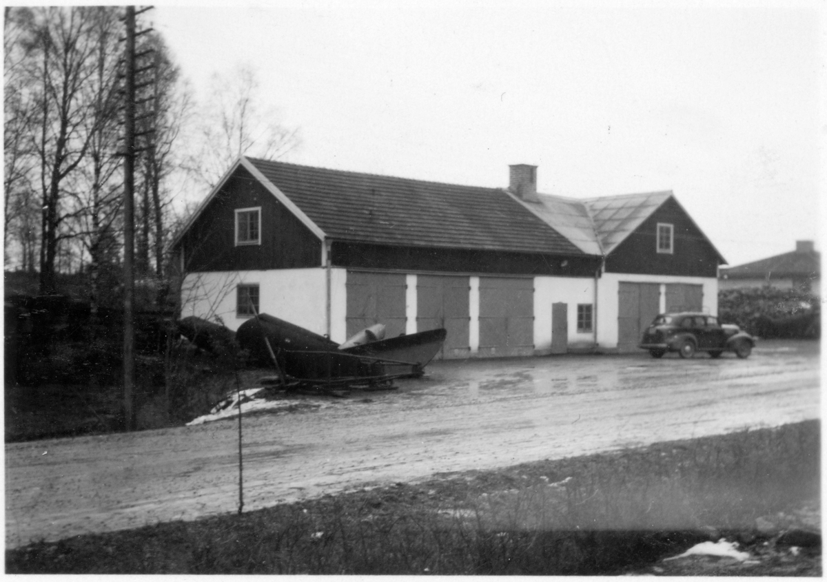 Vägstation C5, Rasbo. Filial Skoby. Garagebyggnad invid väg. Spetsplog, sidoplog och personbil framför garaget.