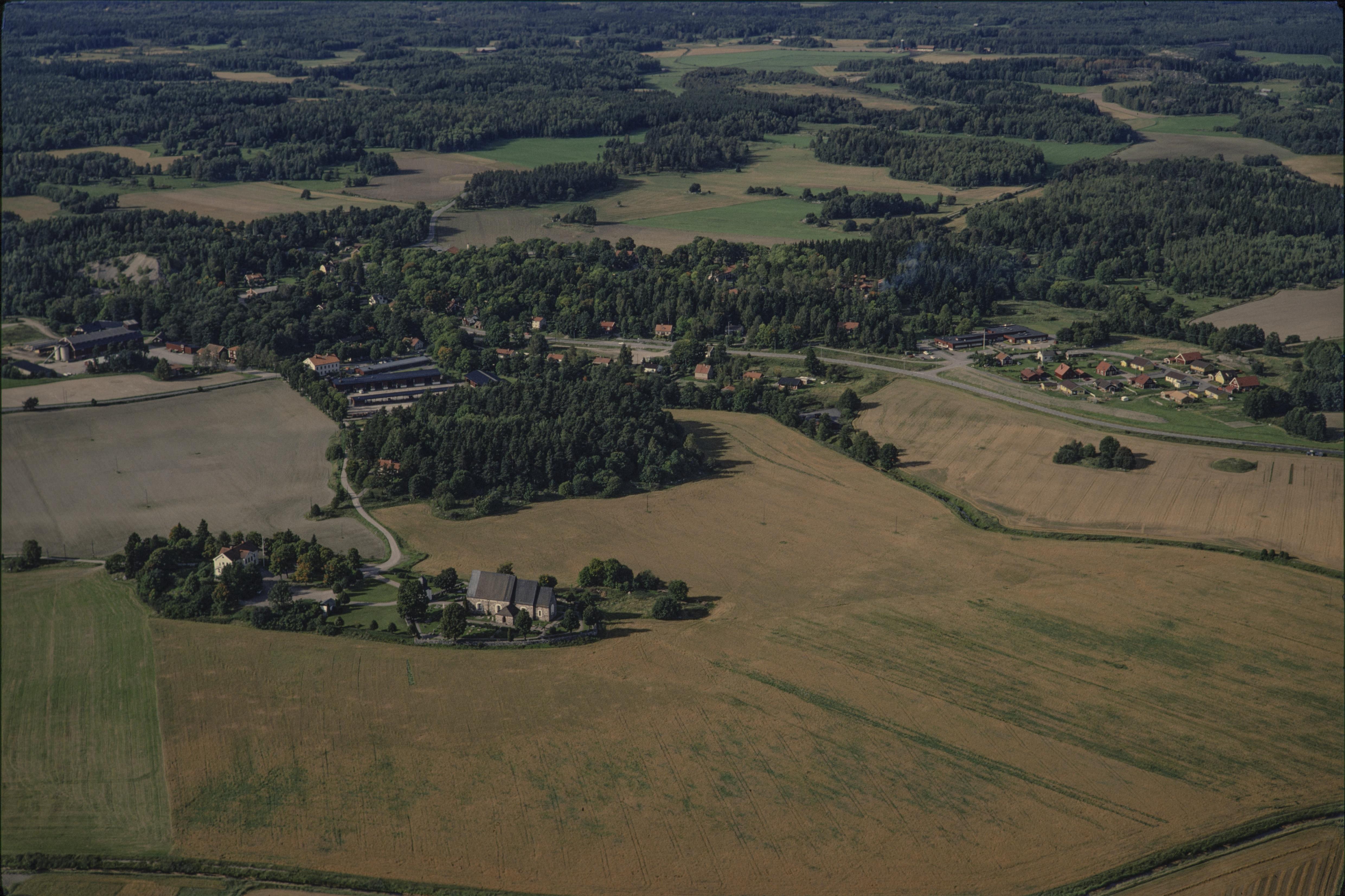 Skederids kyrka nere till vänster. Vid bildens mitt Finsta herrgård i Finsta by, Husbyån, Brunkebergsbacken och Heliga Birgittas källa RAÄnr Skederid 73:1. Bilden är tagen mot (väderstreck): NV