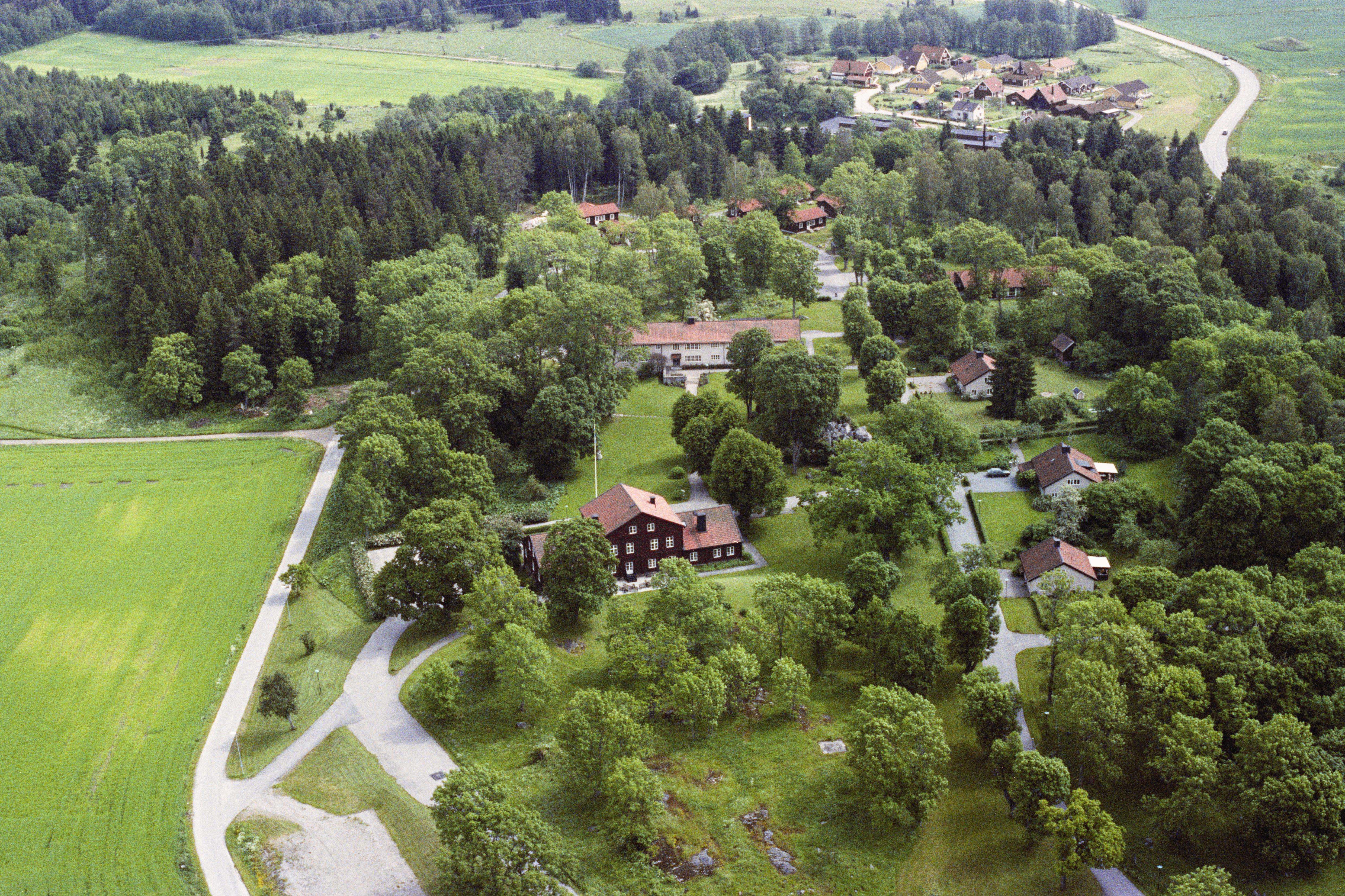 Beskrivning: Finsta herrgård i Finsta by. Fornminnen efter Heliga Birgitta bl.a. "Birgittas grotta" RAÄnr Skederid 6:1 vid bildens mitt. Bilden är tagen mot (väderstreck): Ö