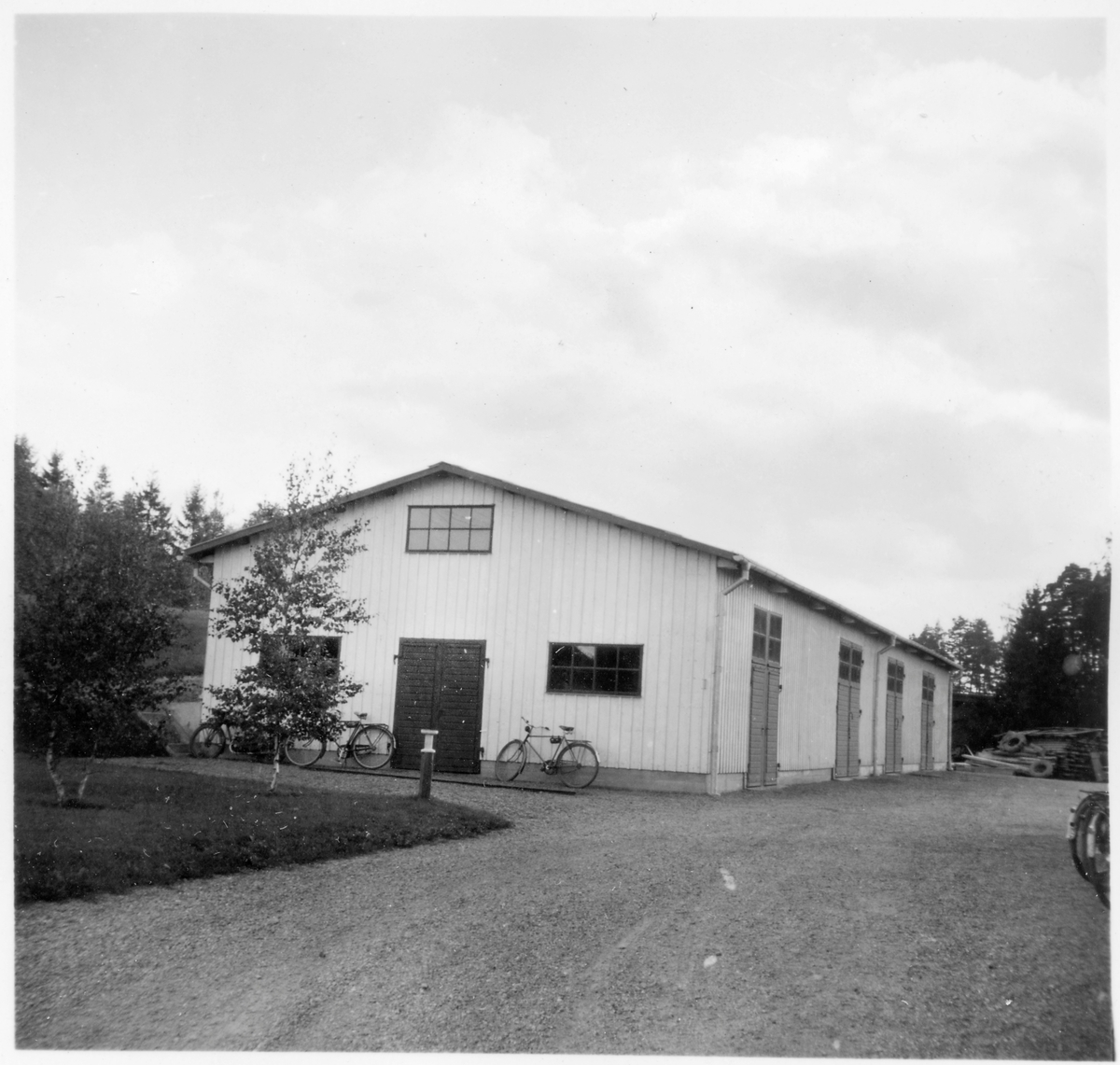 Vägstation D6, Björnlunda. Förrådsbyggnad. Cyklar lutade mot gaveln.