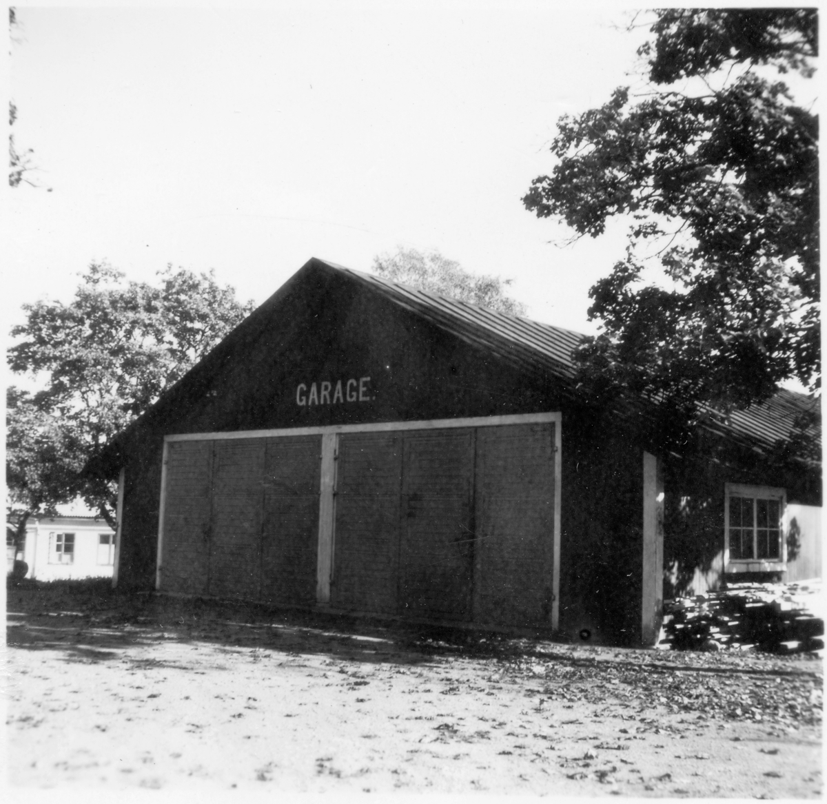 Vägstation D6, Björnlunda, filial Malmköping. Garagebyggnad med portar på gaveln. Ovanför portarna målad text "Garage.".