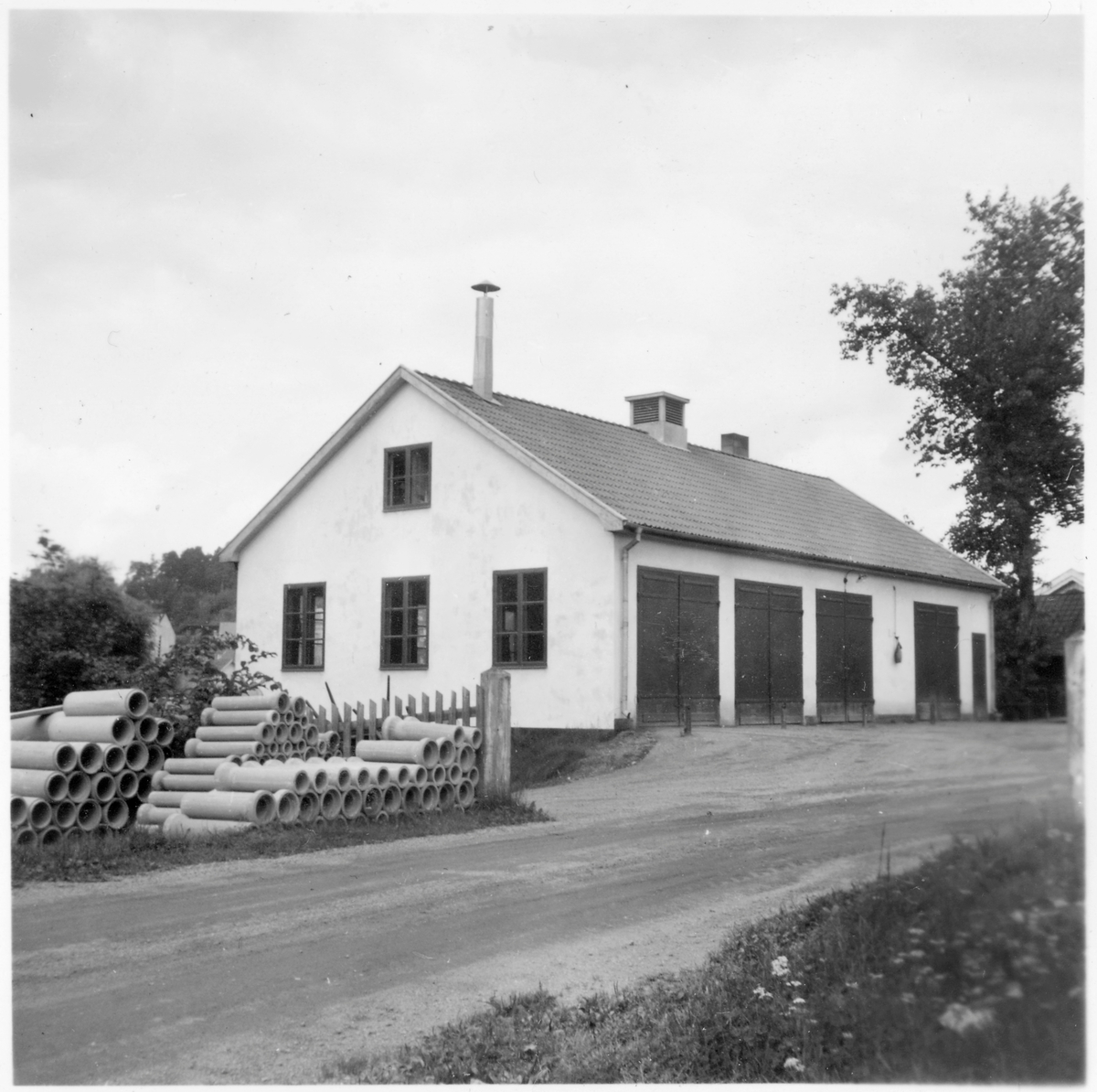 Vägstation E2, Kisa. Byggnad med kontor och förråd i markplan, garageanläggning i souterrängvåning. Garage i markplan. Upplag av cementrör, muffrör. Invid väg.