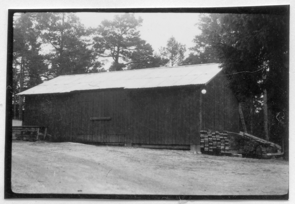 Vägstation B11, Skå. Förrådsbyggnad. Slipsten i slipstenbock. Virkesupplag vid ena gaveln.
