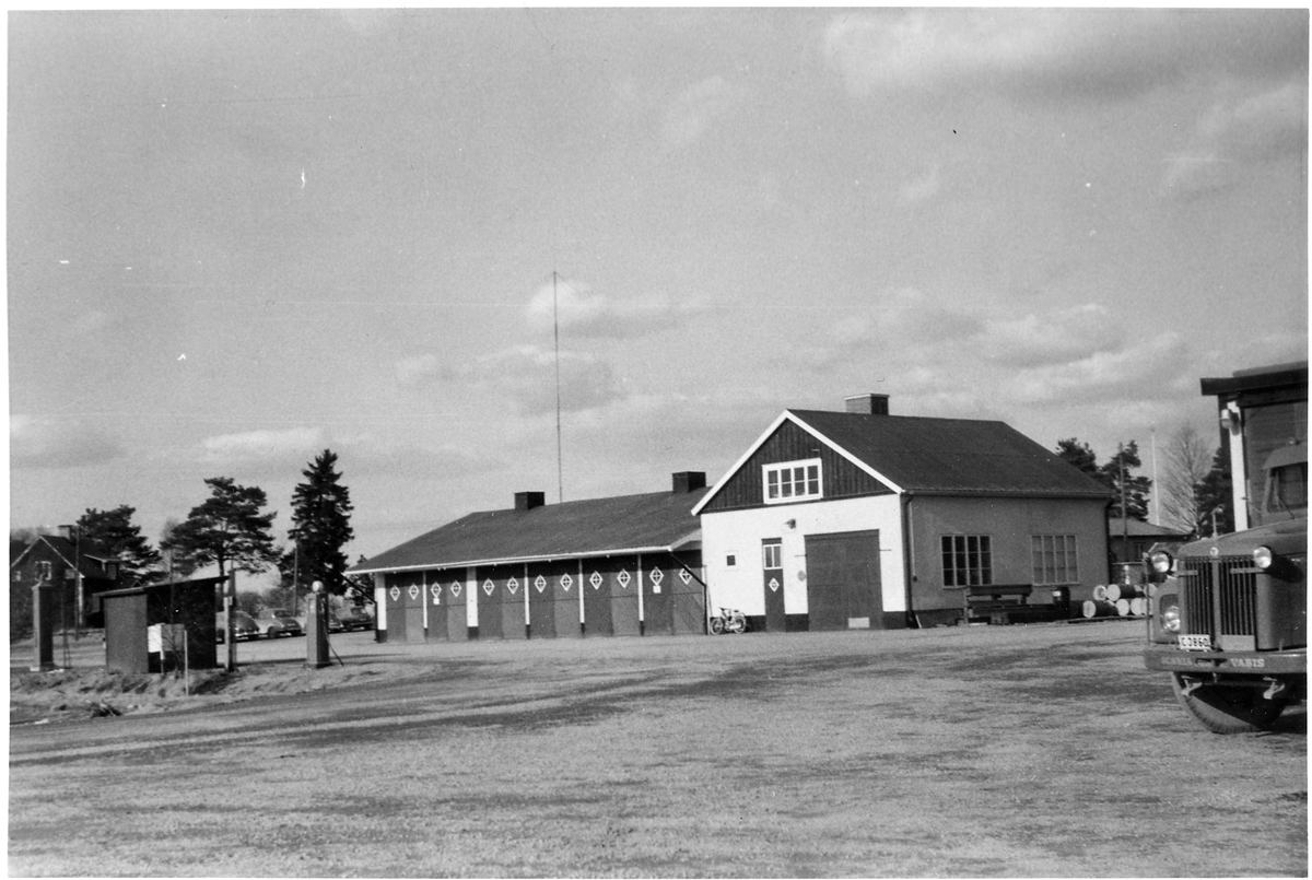 Vägstation C5, Rasbo. Verkstads- och garagebyggnad. Bensinpump (drivmedelspump). Personbilar vid bortre gavel. Lastbil Scania-Vabis, C3860. Radiomast bakom garaget. Moped utanför verkstadsdelen.