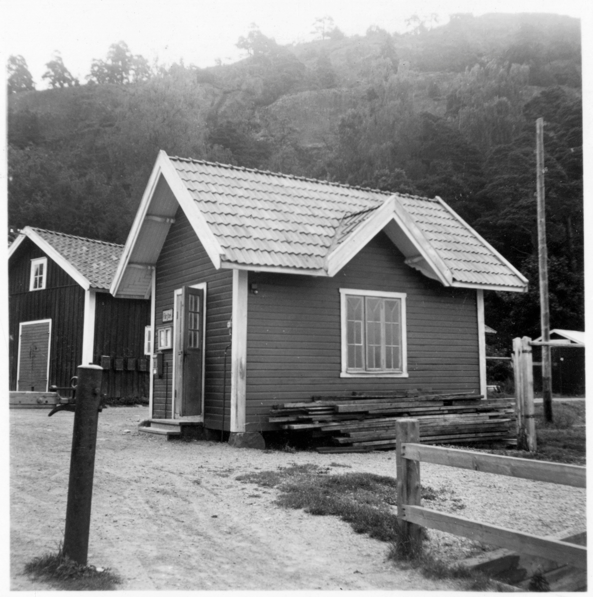 Vägstation E10, Östra Husby. Färjeläge Kvarsebo, D län. Väntkur för de resande, förrådsbyggnad.
