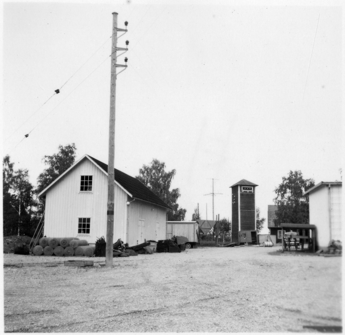 Vägstation E12, Tjällmo. Förrådsbyggnad, garagebyggnad, till höger, med cykelställ med cyklar. Manskapsvagn. Mellan byggnaderna transformatortorn i trä. Bränslefat med handpump. Vid gaveln av förrådsbyggnaden rullar med stängselnät.