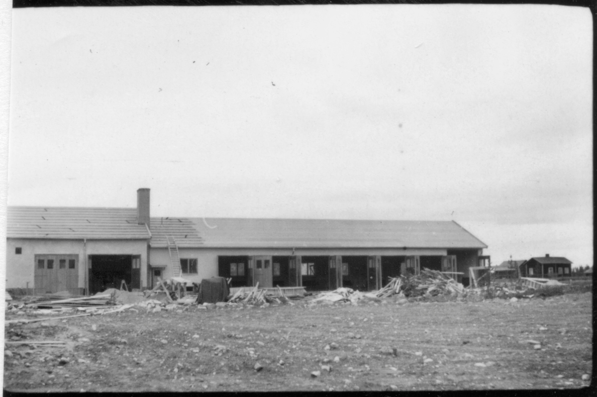 Vägstation AC13, Malåträsk. Vägstationens huvudbyggnad, under uppförande. Från vänster verkstad, kontor, garage. Bostadshus i bakgrunden.