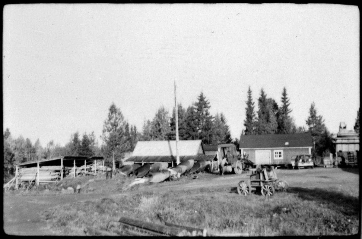 Vägstation AC19, Storuman. Vy över uppställningsplats. Förrådsbyggnader, stenkross, väghyvel, grussorteringsverk, personbil.