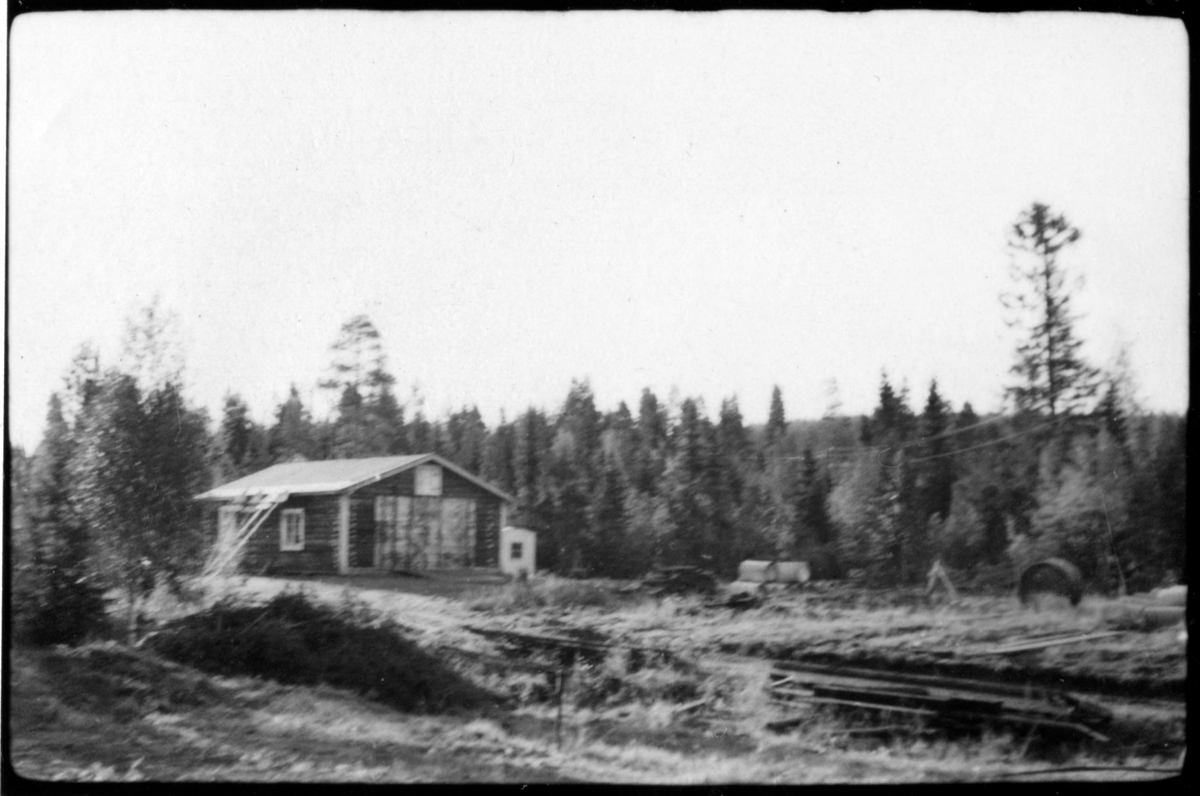 Vägstation AC19, Storuman. Garagebyggnad, i skogsområde. Vägmärken lutade mot byggnaden.