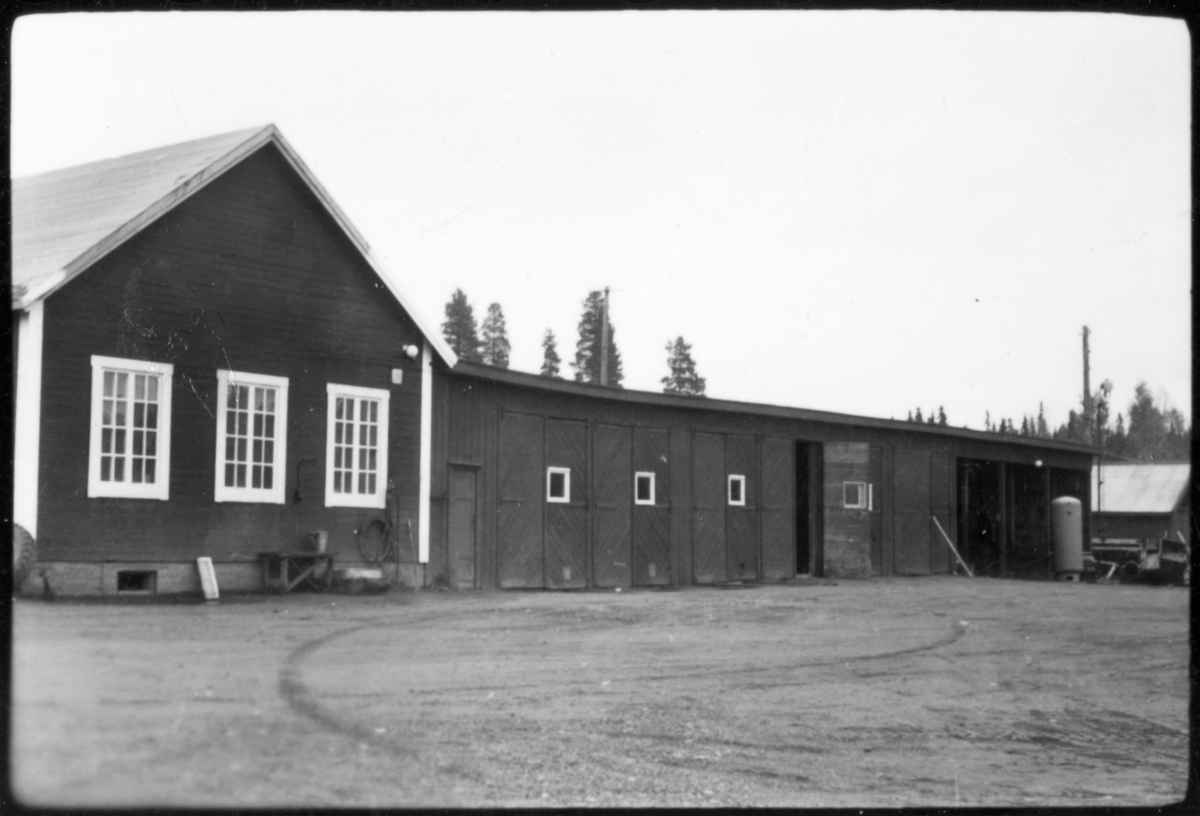 Vägstation AC19, Storuman. Förrådsbyggnad och garagebyggnad byggd i vinkel. Eventuellt gengasaggregat för lastbil utanför garageport.