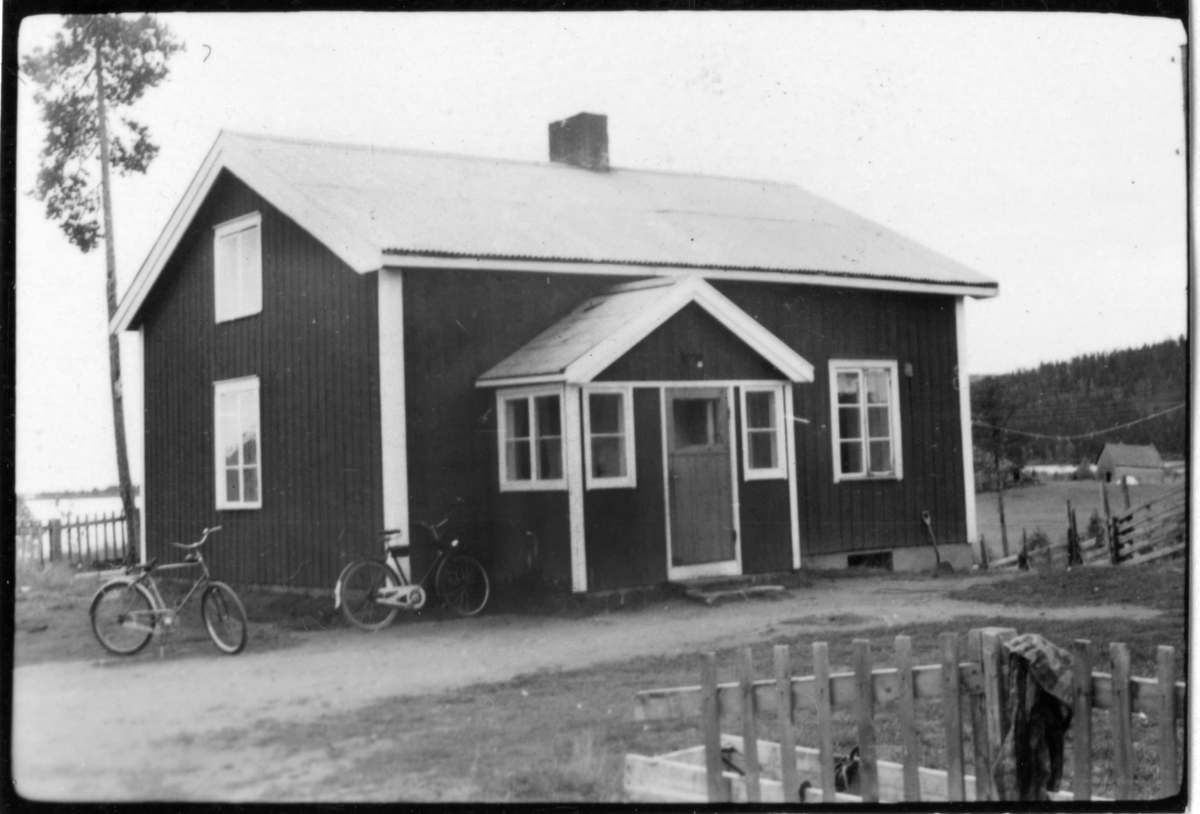 Vägstation AC20, Sorsele, färjvaktarbostaden i Stennäset. Bostadshus, färjvaktarens bostad. Cyklar framför byggnaden. Staket runt byggnaden. Färjeläget i bakgrunden.