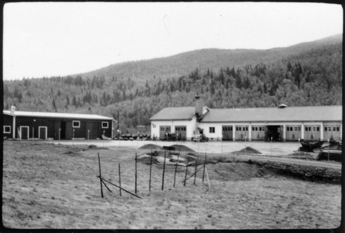 Vägstation AC21, Tärnaby. Vägstationens huvudbyggnad, med från vänster verkstad, kontor, garage. Förrådsbyggnad till vänster. På garageplan sidoplogar, spetsplogar, personbil.
